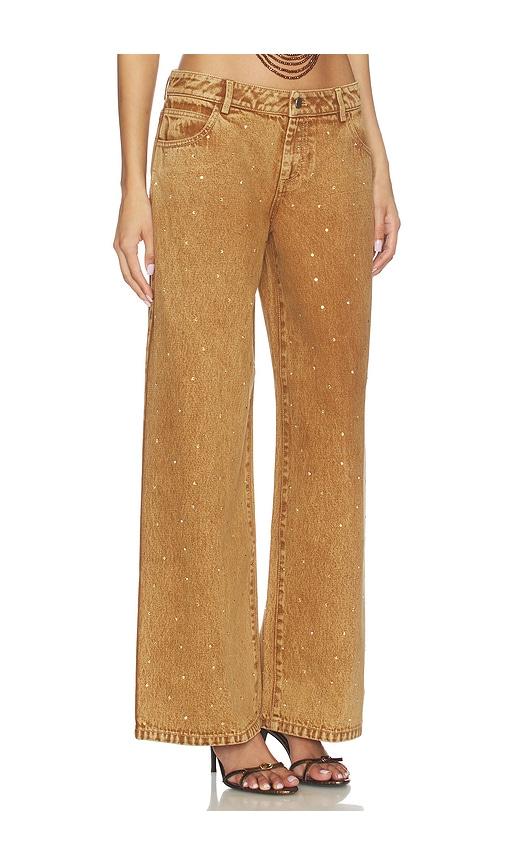 LESLIE AMON X REVOLVE DENIM RHINESTONE FESTIVAL PANTS IN BROWN.