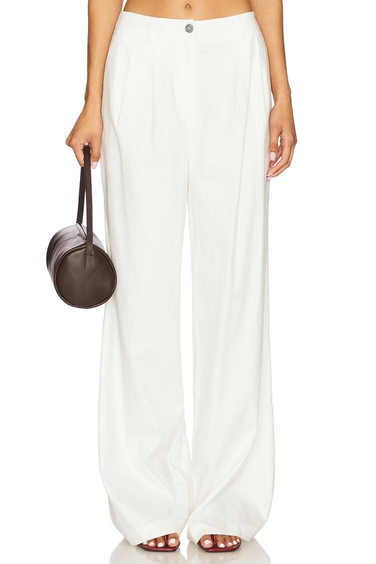 Effortless white linen Jolene Pant from Lovers and Friends brings resort-ready ease to your warm-weather wardrobe. Made with breathable midweight linen and a soft viscose lining, these wide-leg palazzo pants drape fluidly for a relaxed silhouette. The zip fly with a single button provides a clean front, while the four pockets add practical polish. A crisp, minimal appeal pairs beautifully with silk blouses for brunch, or a simple tee for vacation days. Versatile, airy and undeniably chic, they elevate everyday elegance with understated luxury.