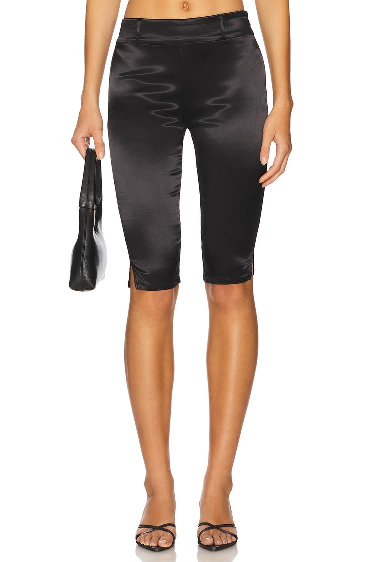 Elegantly glossy and undeniably chic, Miaou's Harley Capri elevates warm-weather dressing with a streamlined, knee-hitting silhouette. The mid-weight high-shine jersey drapes sleekly in a black satin-like finish, infused with rayon, viscose, and a touch of spandex for subtle stretch. A hidden side zipper keeps the line clean, while front belt loops and a slim, mid-rise waistband anchor the look. Side hem slits ensure ease of movement as you transition from day to night. Pair with a crisp blouse or a knit tee for a timeless, city-ready vibe.