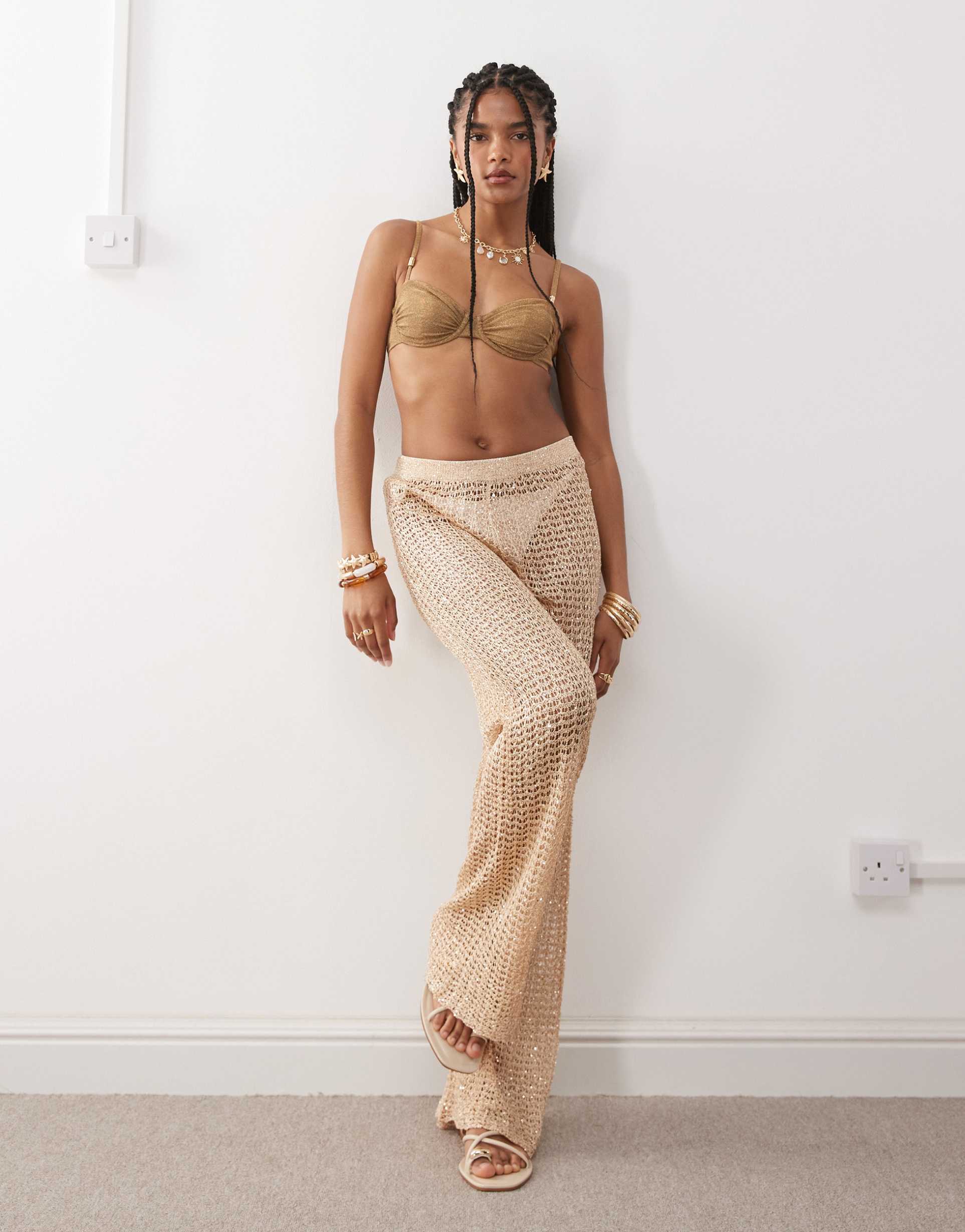 Bring playful charm to your beachwear collection with these Miss Selfridge premium sequin beach pants. Crafted from lightweight polyester knit fabric with an open crochet texture, these high-rise pants feature a comfortable elasticated waistband and a flowing wide-leg silhouette. The all-over delicate sequin embellishments add a subtle sparkle, perfect for catching the sun during your vacation or casual seaside outings. Their full-length hemline and breathable design make them ideal for warm weather, effortlessly combining bohemian flair with trendy comfort. These pants are a stunning choice for beach days or relaxed summer evenings.