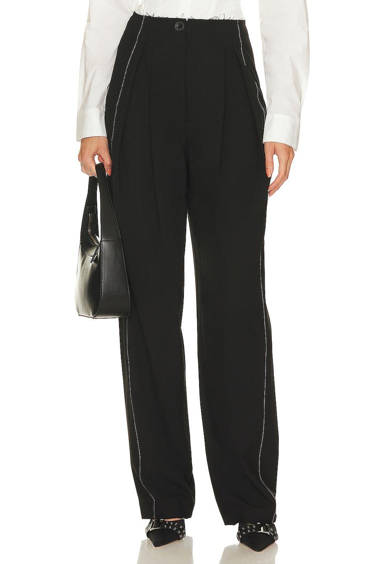 Meet a polished essential with a modern edge: the NBD Bridget Aitana Trouser in black. A luxe wide-leg silhouette with structured pleats and crisp white contrast topstitching, it drapes with refined ease. Crafted from a polyester–viscose blend with a touch of elastane for subtle stretch, it moves from desk to dinner in comfort. The front zip fly with a single button keeps the line clean, while the frayed raw-cut trim adds a contemporary, off-duty vibe. Perfect for the office, meetings, or weekend outings—pair with a crisp shirt or knit for instant chic.