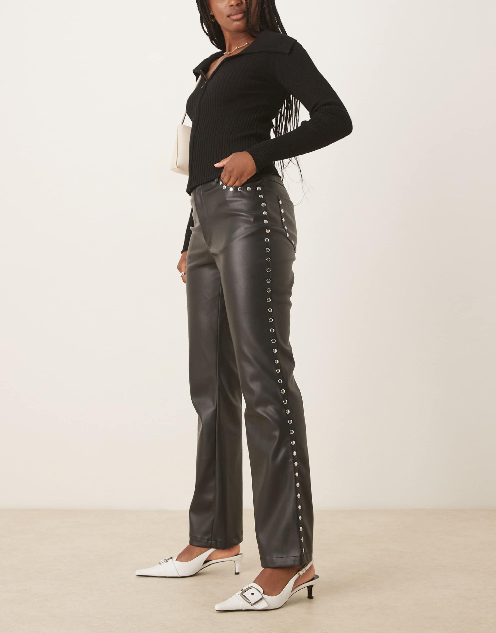 Exude bold sophistication with these high-rise PU studded pants from Never Fully Dressed. Crafted from matte black polyester with a sleek straight-leg silhouette, they feature edgy stud detailing along the side panels that elevate your streetwear and night-out looks. The flat-front waistband with belt loops and concealed fly ensures a streamlined fit, while functional pockets add practicality. Perfect for autumn and winter, these pants blend modern chic with a touch of rebellious flair, making them a versatile staple for casual and edgy ensembles alike.