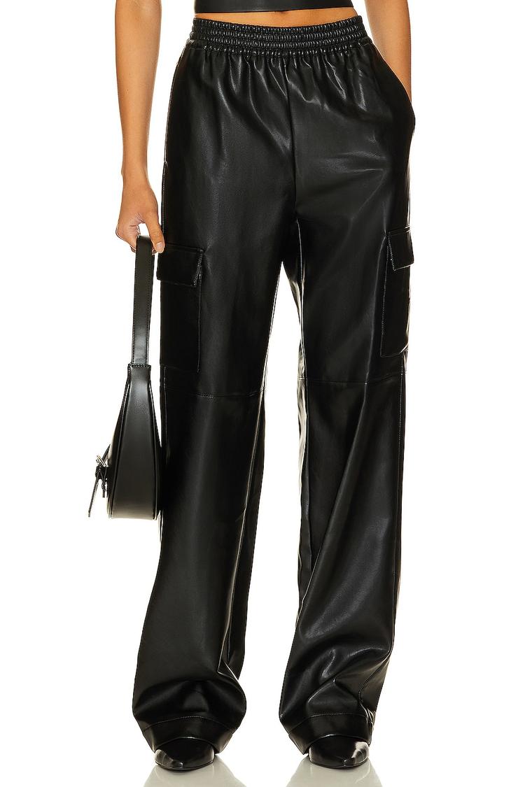 Elevate your urban wardrobe with the Edwina Cargo Pant from Nicholas. Crafted in a glossy faux leather finish, these full-length pants drape a relaxed, wide-leg silhouette that moves with ease. A smocked elastic waist provides effortless pull-on comfort, while four pockets—including two cargo pockets—add practical edge to this sleek, city-ready staple. The hard-wearing yet soft-touch fabric blends polyurethane, viscose, and a polyester lining for a durable, luxe feel. Pair with a cropped top and chunky boots for a bold day-to-night look that travels from street to soirée with confidence.