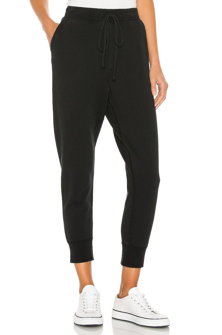 Elevate your everyday with these sleek black joggers that blend pure comfort with easy, put-together style. Crafted in soft cotton French terry (100% cotton), they sit at a relaxed mid-rise with an elasticized drawstring waist for a personalized fit. Side slant pockets and back faux pockets keep the silhouette clean, while the cuffed ankle creates a modern, streamlined line. A touch of intentional distress adds character, making them versatile enough for lounging at home or running around town. Pair with a tee and sneakers for casual days, or a knit for a city-ready, athleisure look.