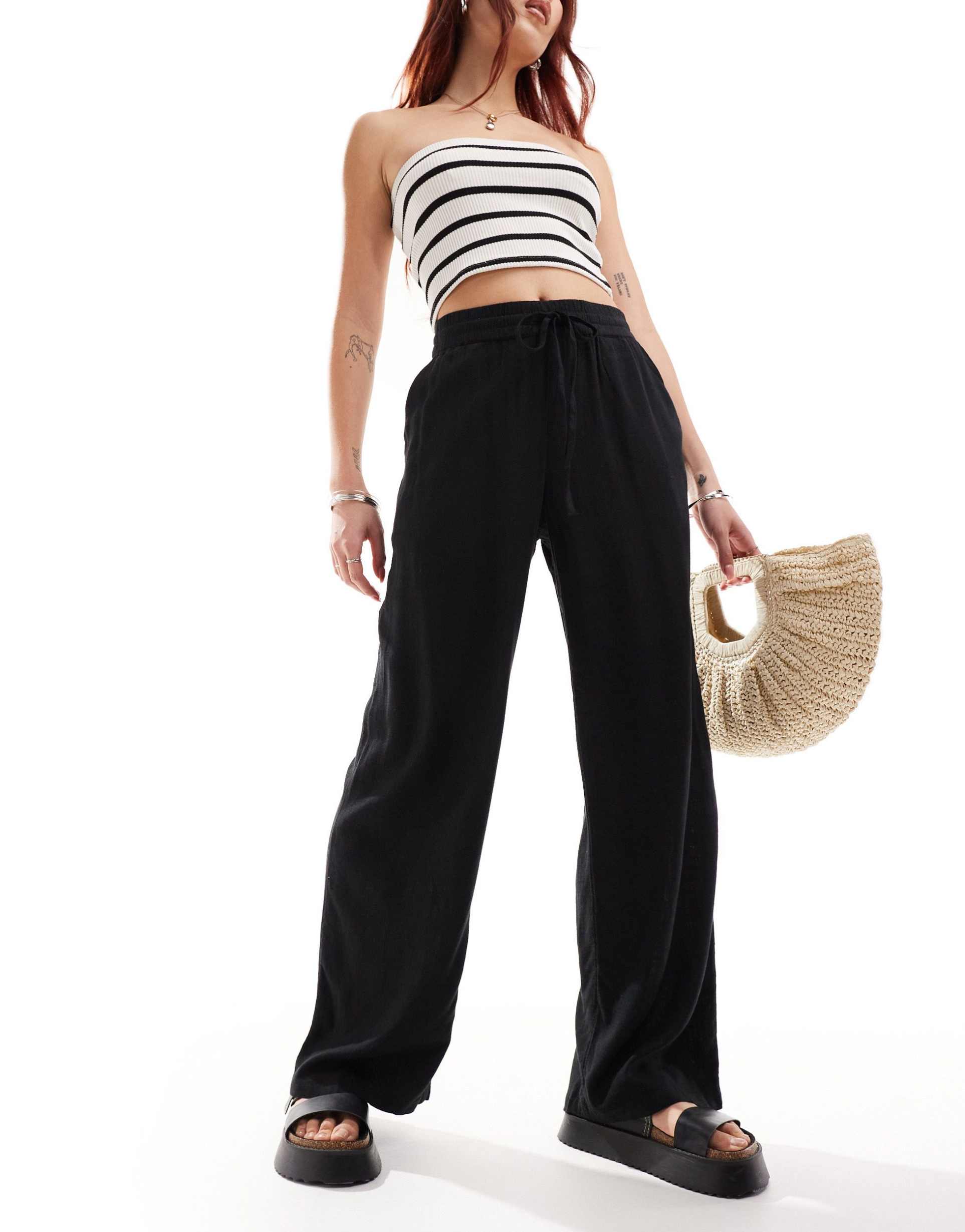 NOISY MAY LOOSE FIT LINEN MIX PANTS IN BLACK - PART OF A SET