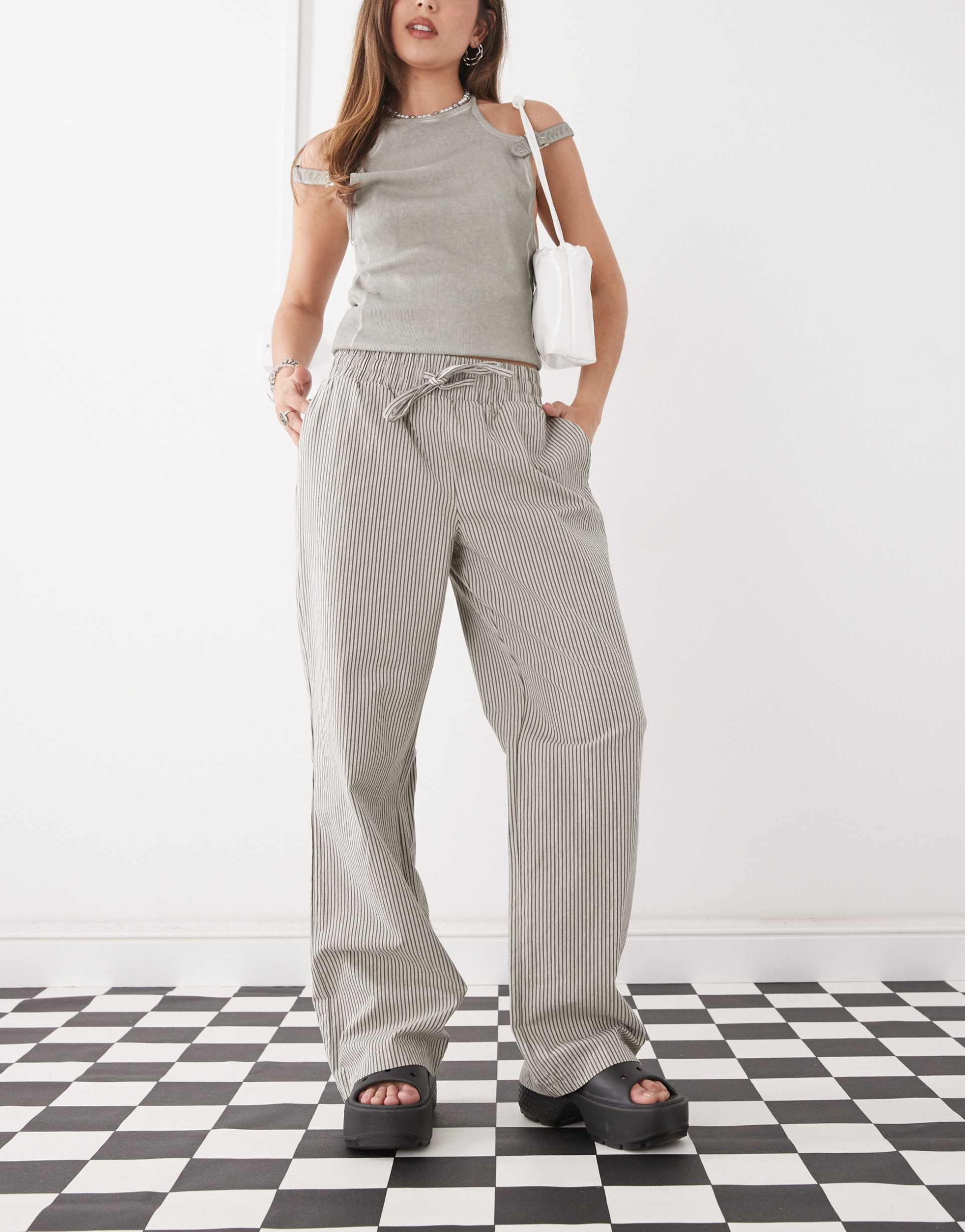 NOISY MAY TIE FRONT WIDE LEG PANTS IN GRAY STRIPES