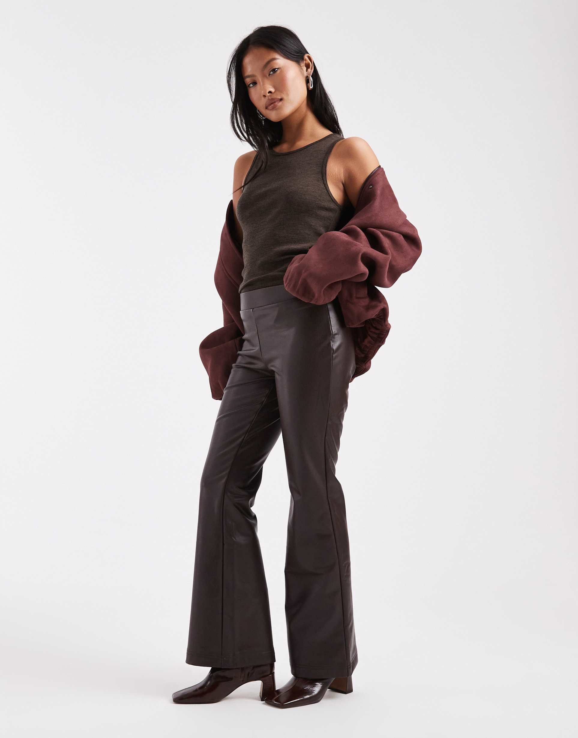 ONLY PETITE FAUX LEATHER FLARED PANTS IN BROWN