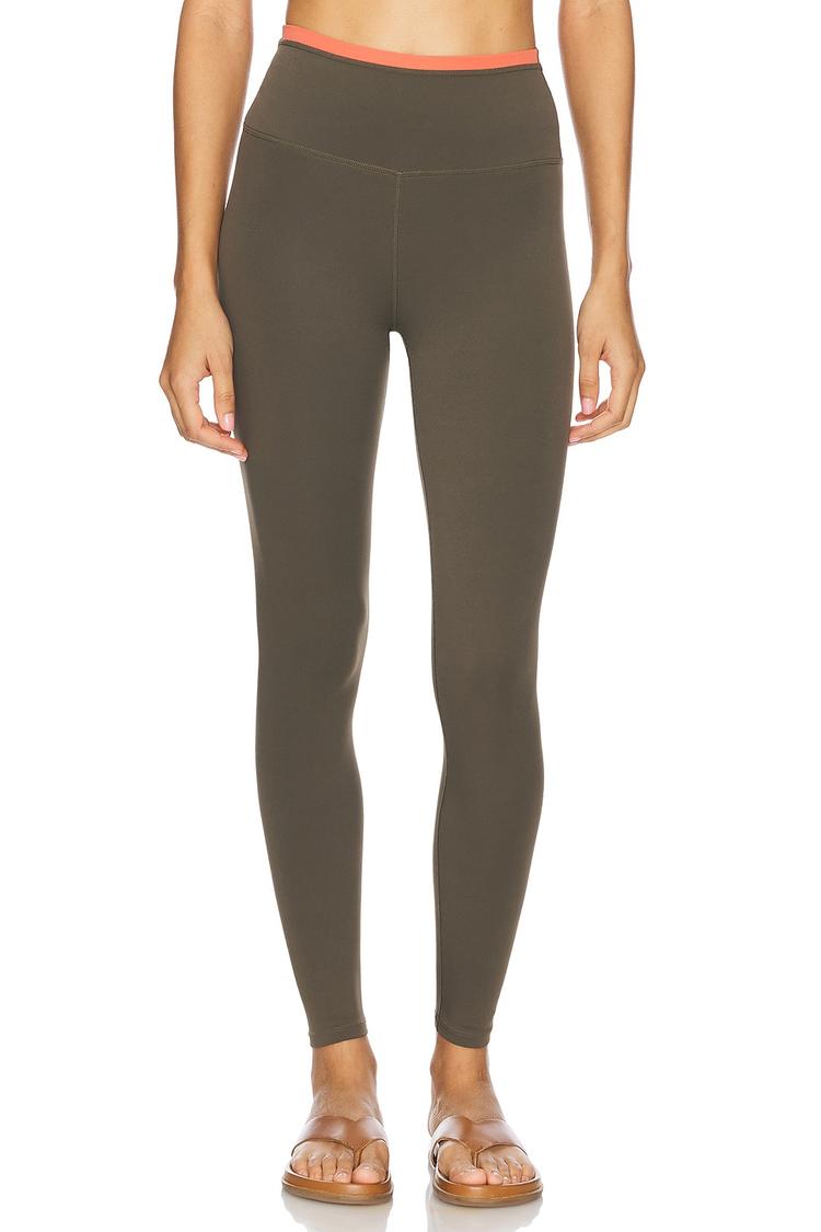 Effortless, versatile athleisure that moves with you. The Vita Full Length Legging from P.E Nation comes in a deep olive shade with a coral contrast trim at the elastic waistband. Crafted from a durable nylon/elastane blend (82% nylon, 18% elastane), it delivers supportive stretch and shape retention for workouts or everyday wear. The pull-on silhouette rides smoothly against the skin, while rubberized logos at the back waistband and hem provide signature brand detail. A clean, streamlined finish makes it easy to pair with crops, hoodies, or oversized tees for a modern, athletic look.