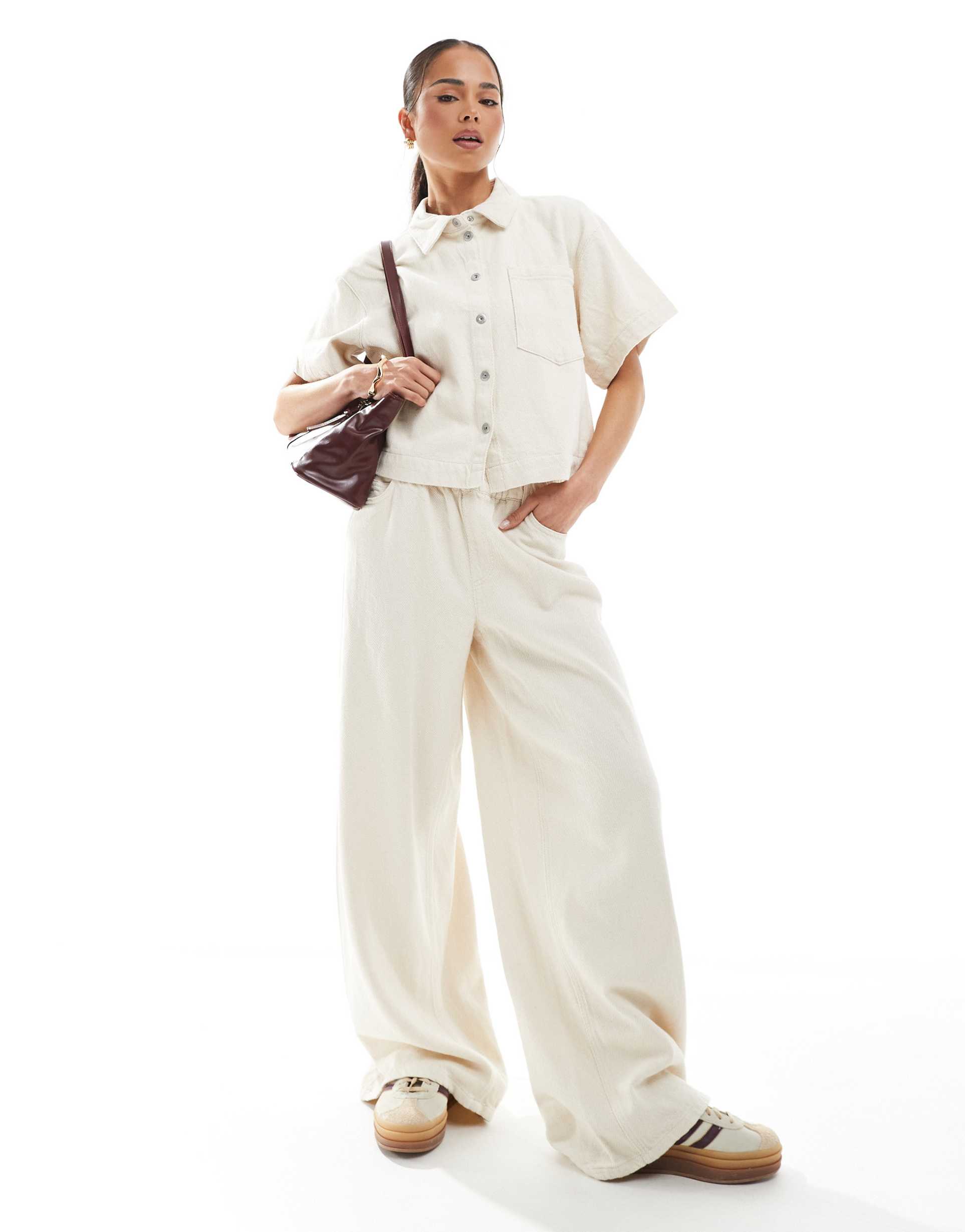 PIECES TEXTURED TWILL WIDE LEG PANTS IN RAW COTTON CREAM - PART OF A SET