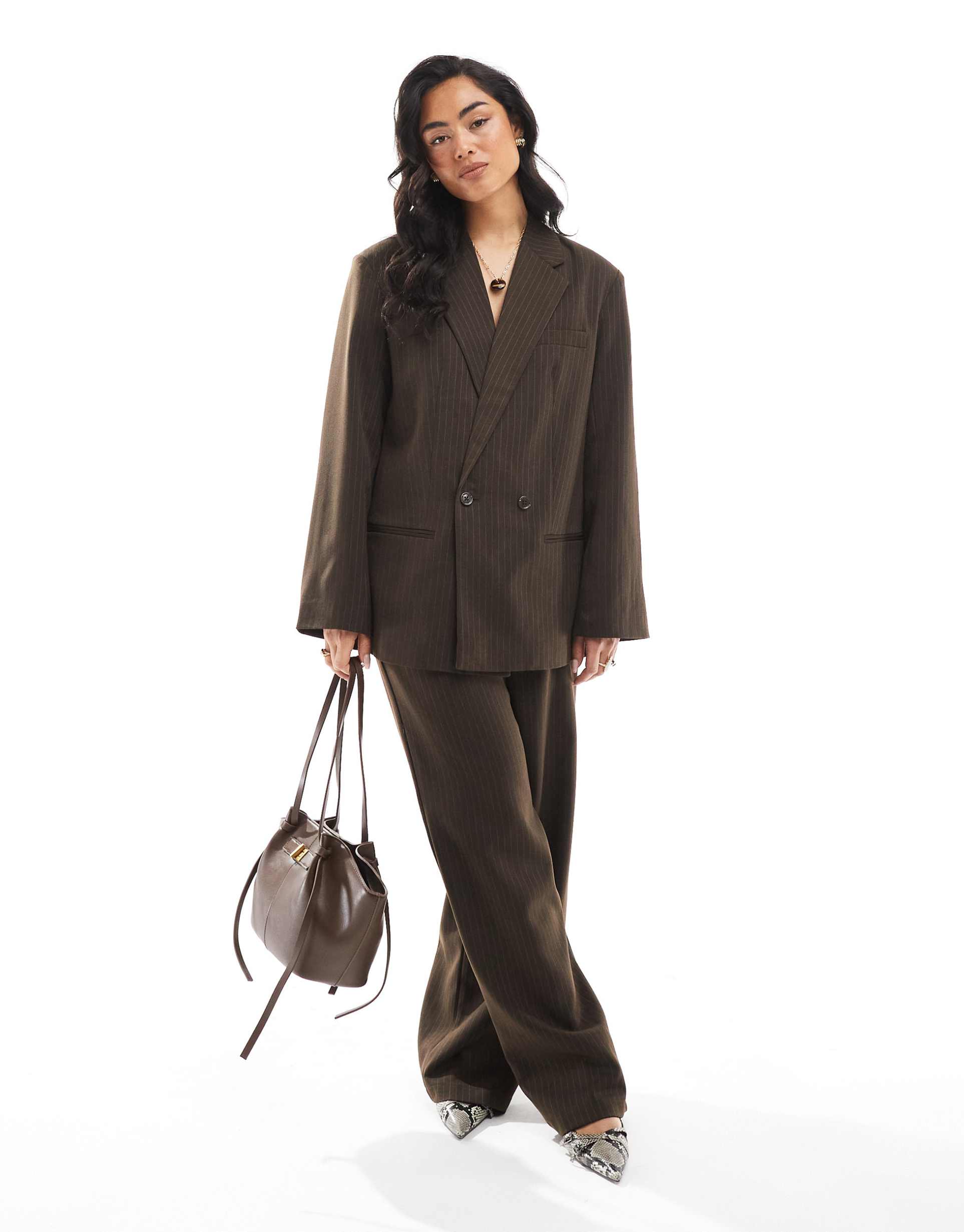 PIECES WIDE LEG TAILORED PANTS IN CHOCOLATE BROWN PINSTRIPE - PART OF A SET