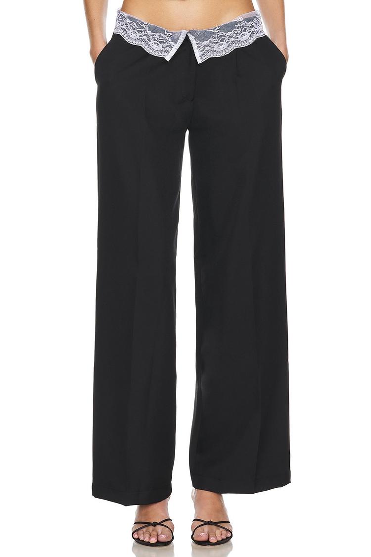Elevate your clean-line wardrobe with the Suri Suit Trousers. A timeless black wide-leg silhouette, these full-length pants skim the body for a poised, leg-lengthening look. The lace trim at the waist adds a delicate, premium twist, while a classic zip fly with button keeps the fit secure. Side slant pockets bring practical ease, and the 22-inch knee opening and generous leg flow create effortless movement. Made in the USA from 100% acrylic, they pair beautifully with tailored blouses or luxe knits for work, evenings, or weekend brunch. A versatile staple that drapes with confidence.