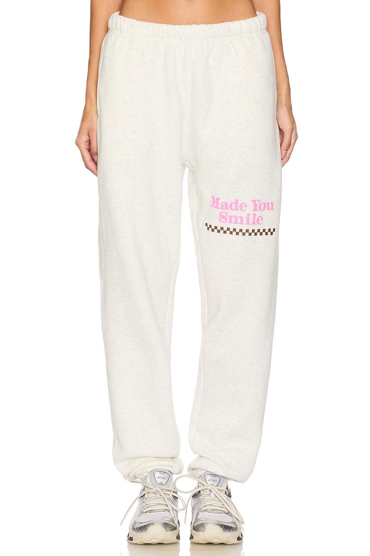 Effortless lounge-worthy staple in crisp white, these Made You Smile sweatpants from The Mayfair Group redefine cozy-cool. Crafted from a cotton-poly blend with a soft fleece lining, they drape in a relaxed jogger silhouette that tapers to cuffed hems. An elastic waistband with a hidden drawstring keeps the fit secure yet flexible, while side pockets add practical ease. Graphic pink prints embellish the front and back for a playful, feminine edge. Perfect for off-duty weekends, travel days, or casual errand runs, these pants pair with hoodies, tees, or sneakers for a laid-back, polished vibe.