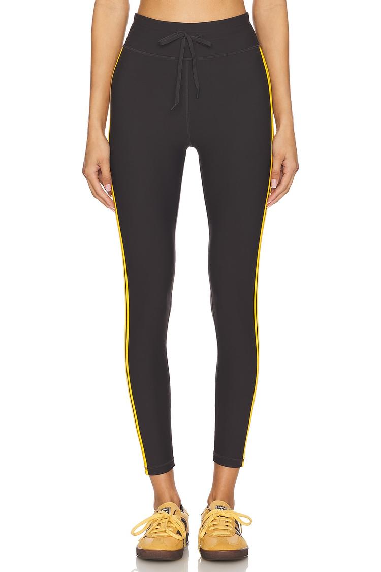 Effortless sport-luxe meets everyday ease in The Upside Beaufort 25in Midi Pant. A sleek black stretch-jersey silhouette hugs the body with a mid-rise, pull-on waist finished by a discreet front drawstring. The signature neon-yellow side stripes create a kinetic, athletic vibe without sacrificing polish, while the recycled nylon blend (75% recycled polyamide, 25% elastane) delivers recovery and comfort from studio to street. The midi length flatters sneakers or heeled sandals alike, making this pant a versatile base for casual, travel or workout looks. Dress it up with a cropped top or keep it pared-back with a tee.
