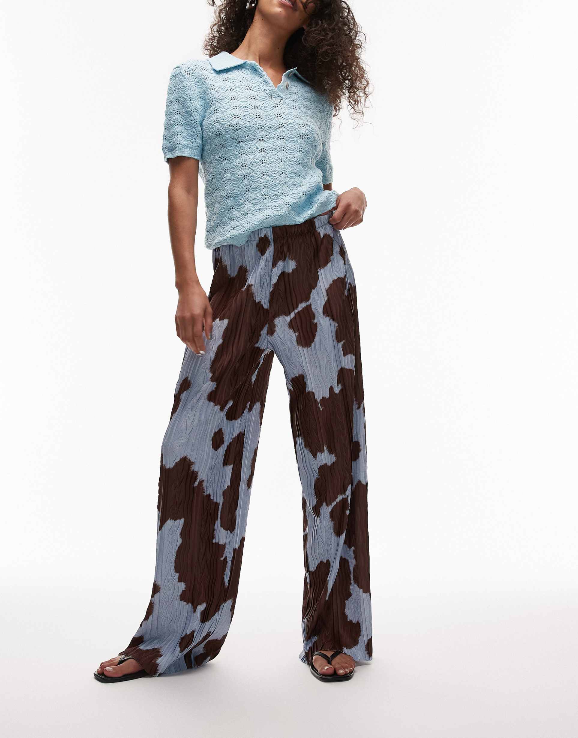 TOPSHOP COW PRINT PLISSE PANTS IN BLUE