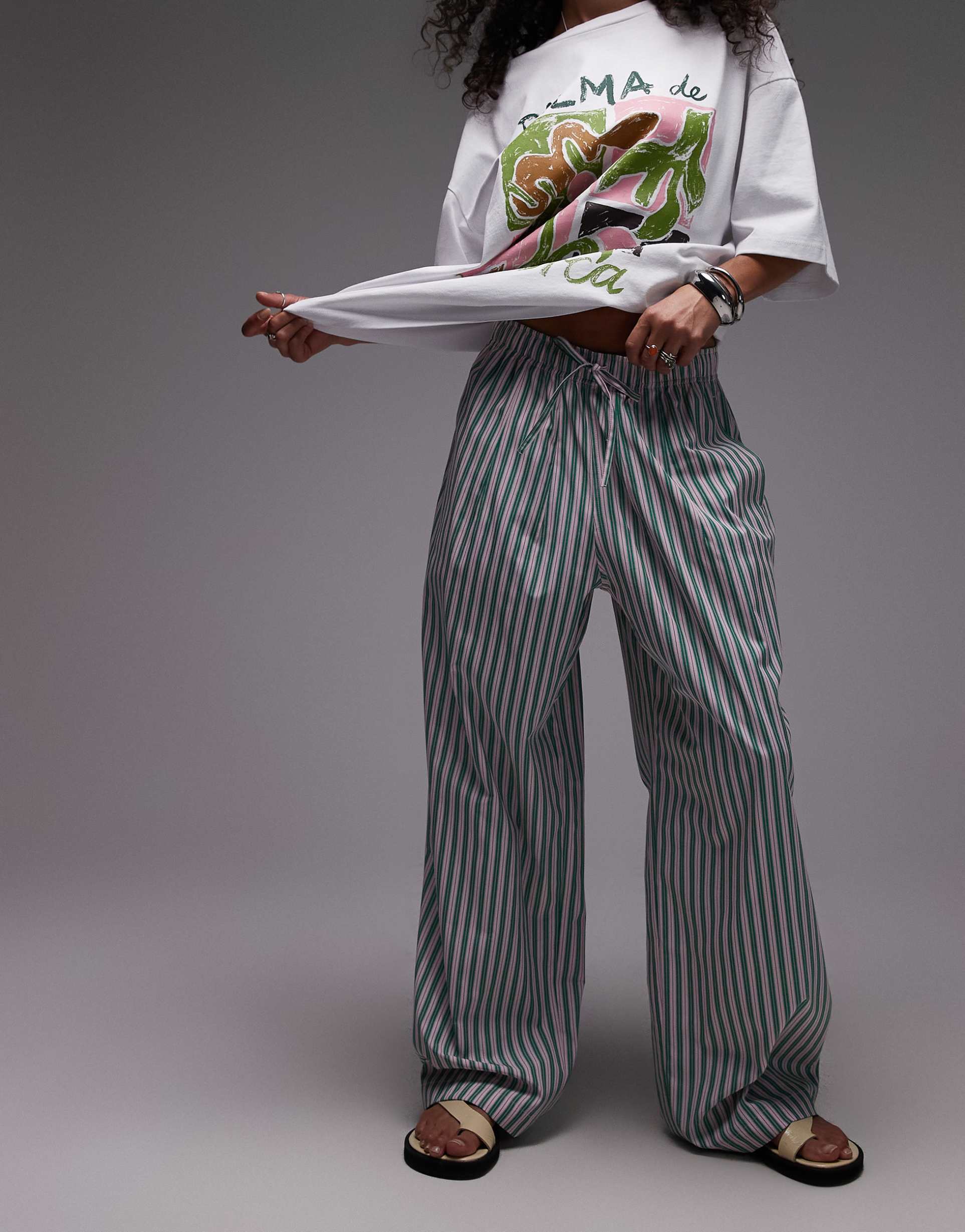 TOPSHOP POPLIN PULL ON WIDE LEG PANTS IN PINK AND GREEN STRIPE