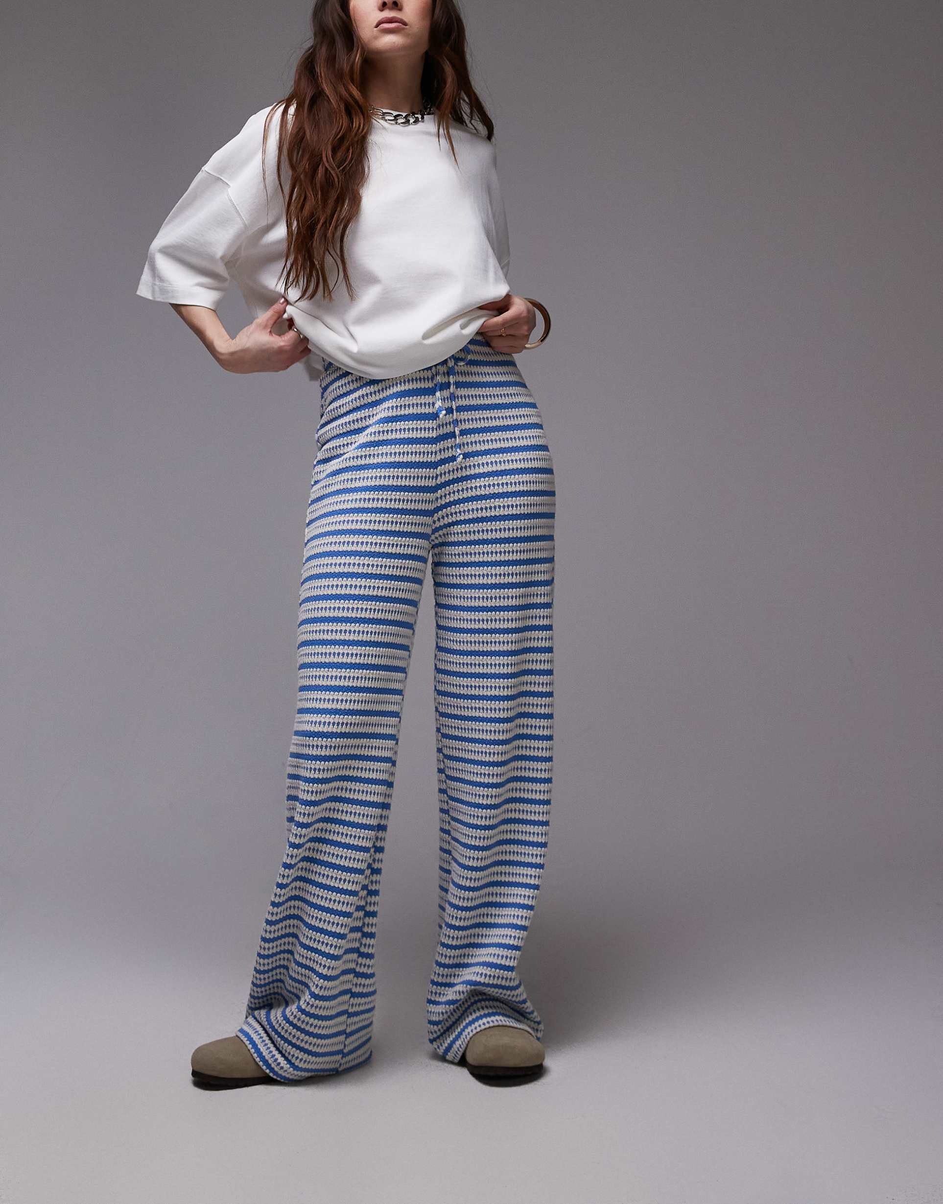 TOPSHOP TEXTURED STRIPE WIDE LEG PANTS IN BLUE