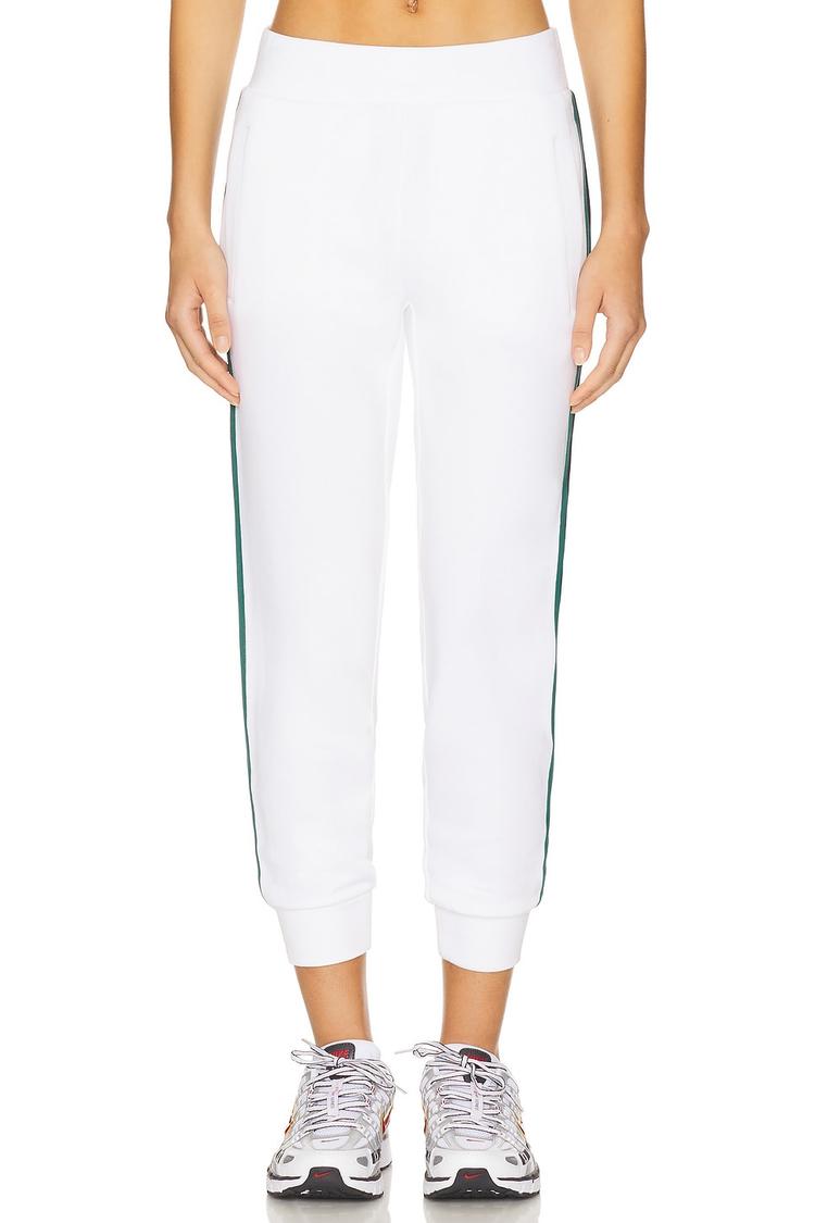 Effortless sport-luxe energy meets clean cred in these Slim Stripe Cuff Pants. Crisp white knit fabric in midweight jersey drapes with a relaxed yet streamlined silhouette, finished with a sharp emerald-green side stripe that runs from hip to ankle. Pull-on comfort comes from the elastic waistband with a functional drawstring and practical side pockets. The 25-inch length tapers through the knee to a cuff, creating a modern, knee-skimming look perfect for casual days, gym-to-street errands, or travel-days that demand ease and polish. Pair with a cropped tee or hoodie for a balanced, contemporary vibe that transitions with you.