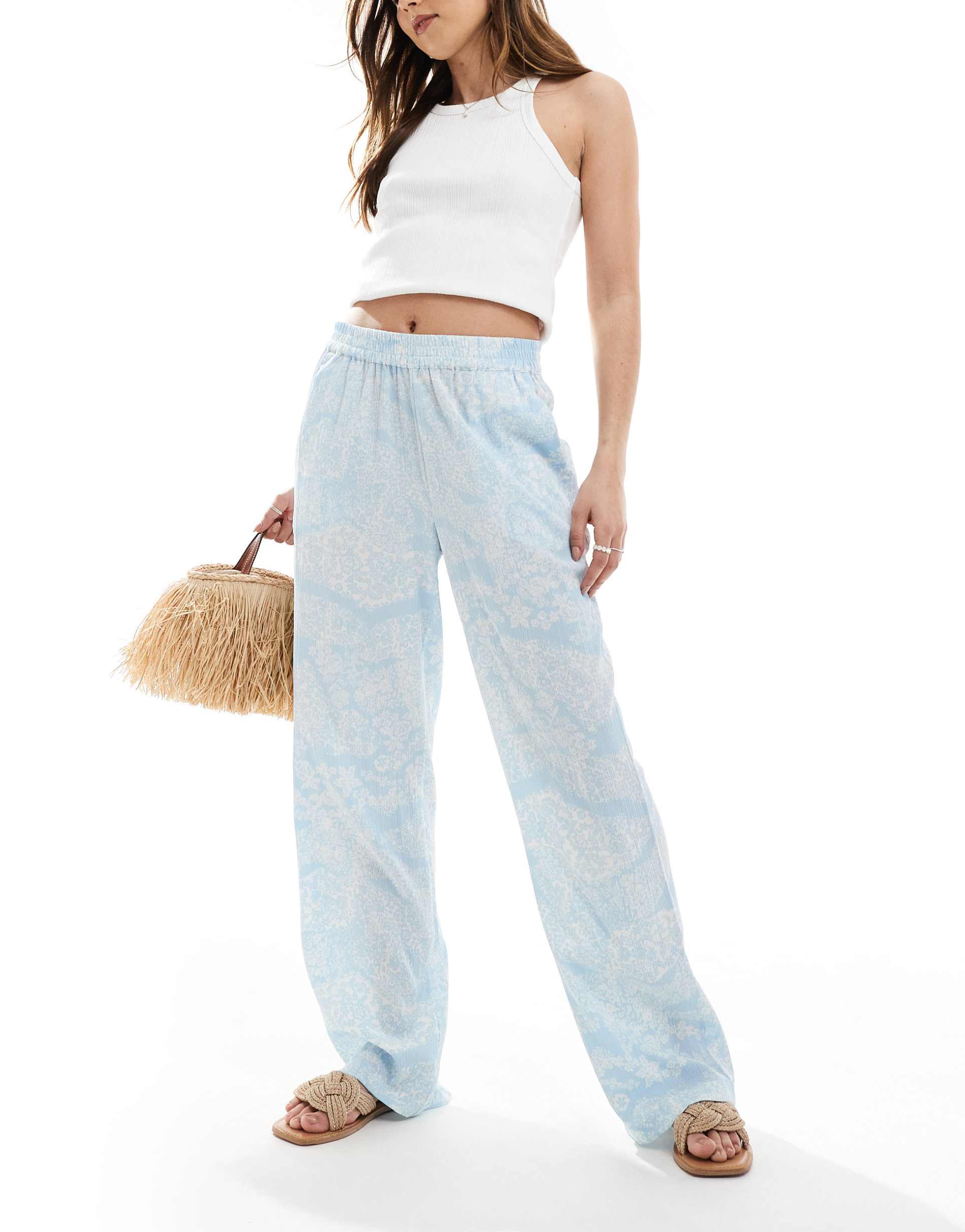 VERO MODA WIDE LEG PULL ON PANTS IN PALE BLUE FLORAL PRINT