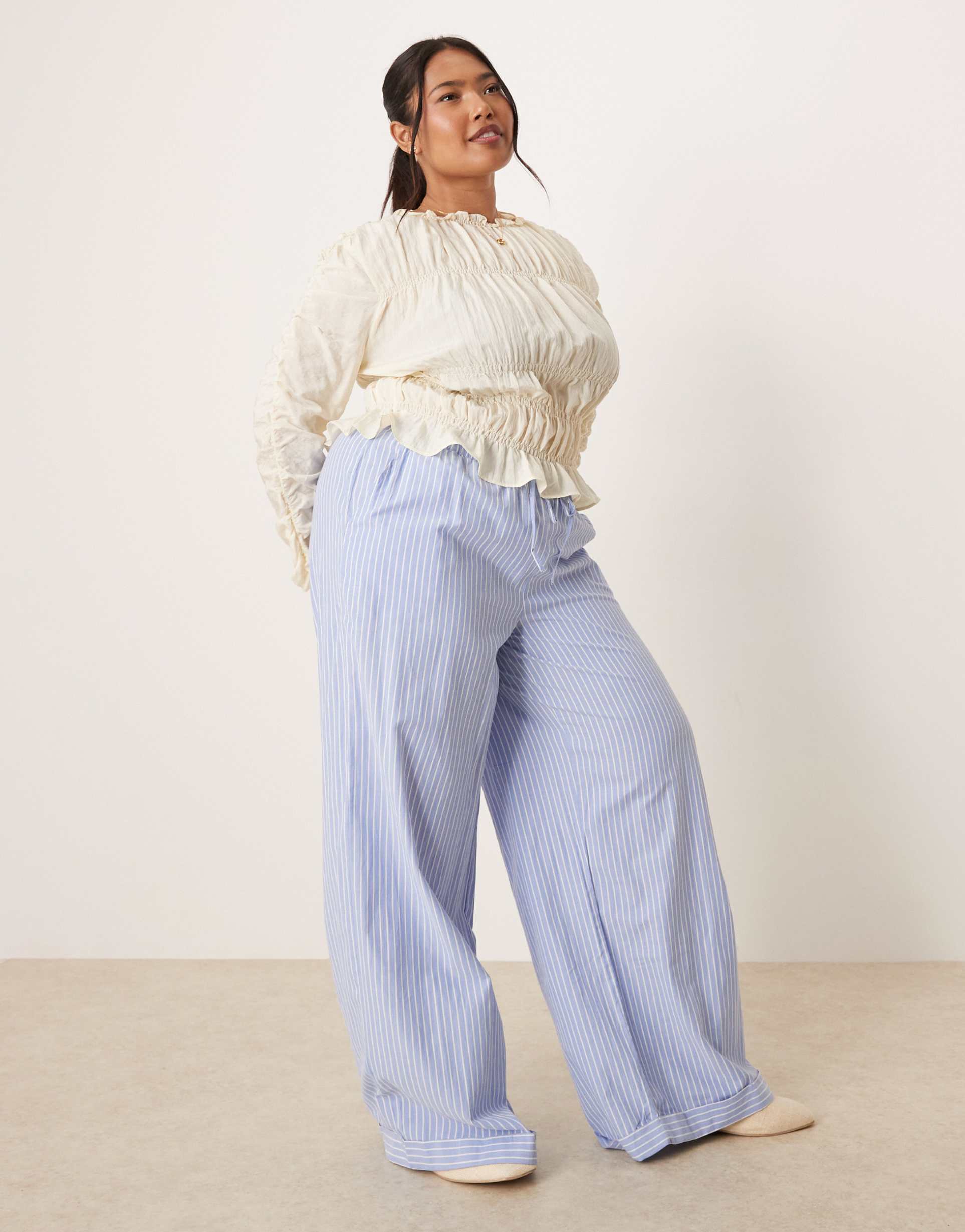 VILA CURVE HIGH RISE WIDE LEG STRIPED DAD PANTS WITH TURN-UP CUFF IN BLUE