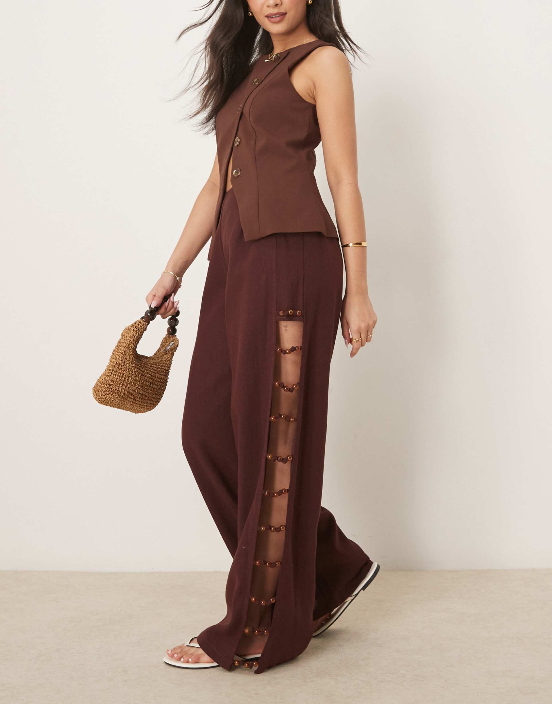 VRG GRL TIA LINEN MIX PANTS WITH BEAD DETAILING IN BURGUNDY