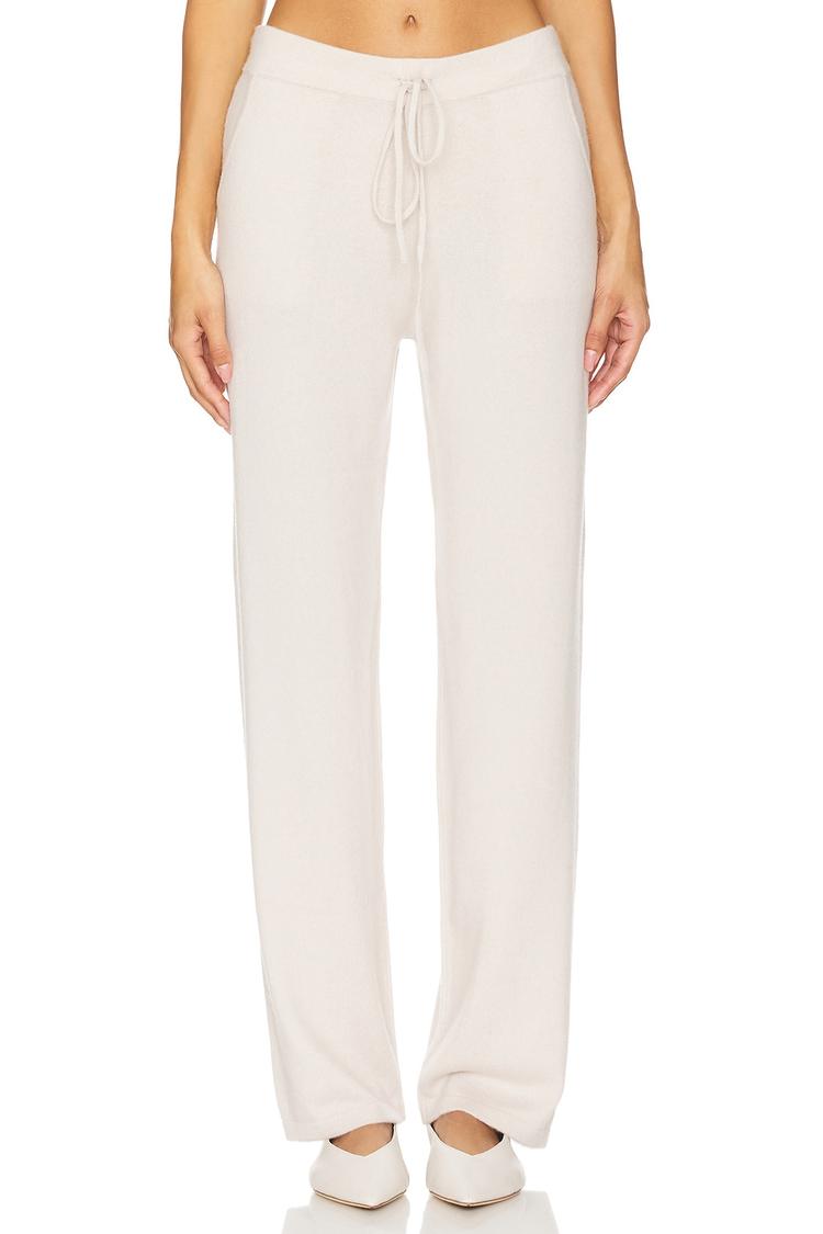 Elevate lounging with Bailey Sweatpants in pure cashmere. These white lounge pants offer a relaxed, straight-leg silhouette with a front drawstring closure and convenient side seam pockets. Crafted in 100% cashmere, the lightweight knit delivers soft, breathable warmth without bulk. The mid-rise waistband sits smoothly, tapering slightly from knee to leg opening for a clean drape. Ideal for at-home comfort or backstage-casual styling, pair with a matching knit top for a monochrome calm or dress up with a silk blouse and blazer for a refined lounge-to-errands look. Dry clean only; made in China, a timeless staple for luxe downtime.