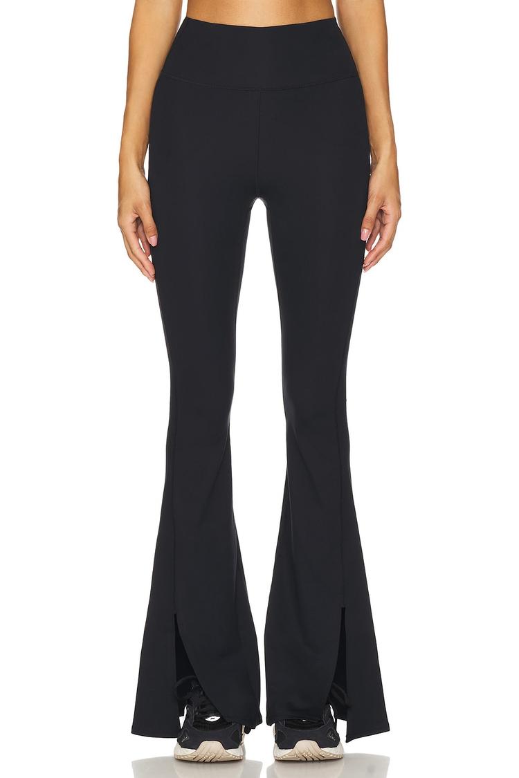 Refined in black, these Movewell Porter Flare Pants blend sport-meets-street in a sleek, pull-on silhouette. The midweight stretch fabric, a sustainable 82% recycled polyester with 18% elastane, flatters through the hip and thigh before dancing into a dramatic flare with a leg-slit that moves with every step. An elasticized waist provides easy all-day comfort, while the clean, solid fabric keeps the look versatile—from gym-to-street errands to travel days. Pair with a cropped tee or tonal knit for a modern, minimalist vibe, finished with sneakers for an athletic-chic statement that travels as well as it moves.