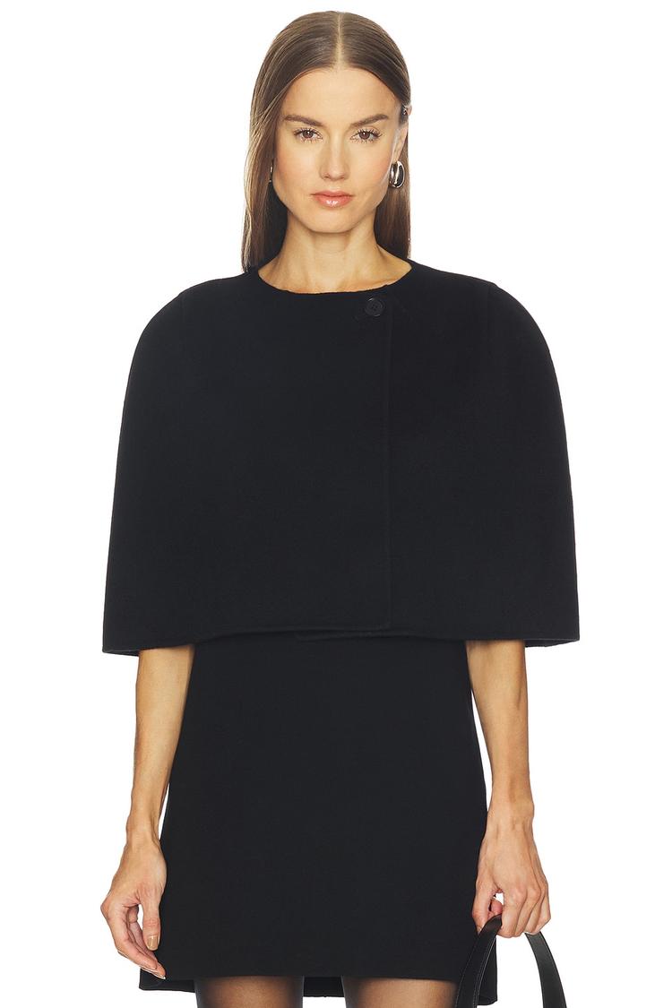 This cropped cape in a luxe double-faced melton wool and cashmere blend offers a tailored fit with a classic round neckline and front button closure. Its sleeveless design and covered back create a chic, vintage-inspired silhouette perfect for autumn and winter. The solid black hue enhances its sophisticated and elegant appeal, making it suitable for casual outings, business casual environments, and cocktail events.