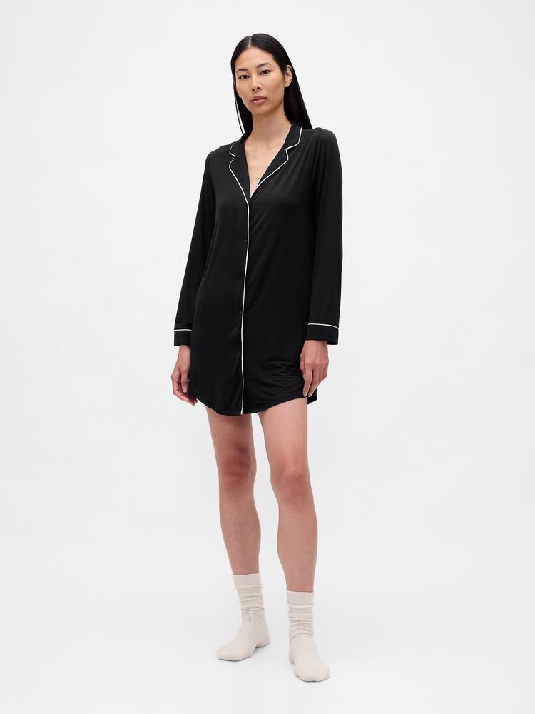 Soft modal fabric shapes a relaxed-fit shirt dress in a sleek matte black hue. Featuring a classic collar and long regular sleeves, this mini-length piece closes with front buttons accentuated by subtle white piping for refined contrast. The clean hemline enhances its minimalist aesthetic, making it an ideal loungewear or casual sleepwear option. Its versatile style suits lounging at home, casual outings, or restful nights with comfortable ease.