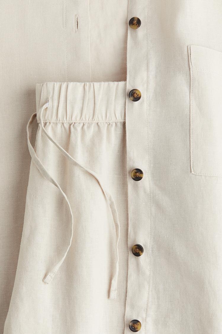 Redefine at-home serenity with this washed linen pajama set from H&M. The shirt features a neat turn-down collar and a row of natural buttons, while the wide-cut pants sit comfortably at the elasticized waist with a soft drawstring. In breathable linen, the off-white tone reads calm and luxurious, perfect for languid mornings or restful nights. Effortless and versatile, this set pairs with slip-ons for lazy Sundays, a robe for chilly evenings, or layered under a robe for travel days. A timeless, breathable staple that ages beautifully with wear.