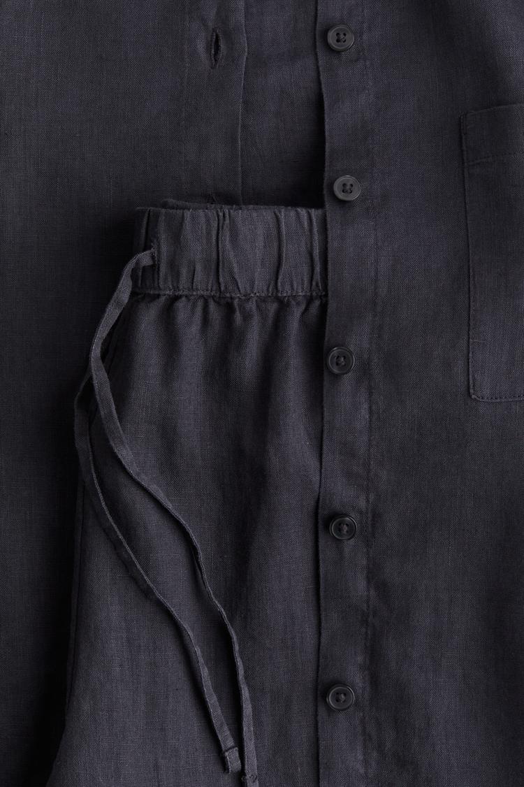 Embrace understated luxury at home with these washed linen pajamas. The shirt pairs a classic turn-down collar with a front placket and a discreet chest pocket, while the wide-cut pants drift effortlessly with an elasticized, drawstring waistband for a custom fit. In a deep, rich black, the breathable linen fabric feels light yet substantial, delivering all-night comfort and effortless drape. Ideal for lazy weekends, late-night reads, or a cozy Instagram-worthy lounge look, this set blends minimalism with practical ease. Slip into this timeless duo and unwind in versatile, everyday elegance.