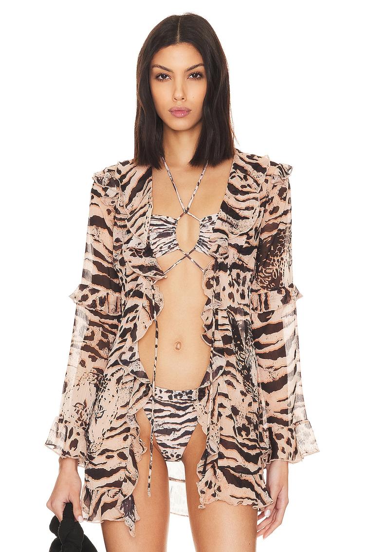 Lightweight georgette fabric and a loose fit define this Paradiso Mini Robe, featuring an all-over animal print in beige and black. The thigh-length cover-up showcases flared long sleeves and ruffle trims along the front, sleeves, and hem, all secured with a front tie closure. Its V-neckline adds a flattering touch to the bohemian and casual chic style. Ideal for beach days, poolside lounging, and vacation looks, this versatile robe brings effortless trendiness to your warm-weather wardrobe.