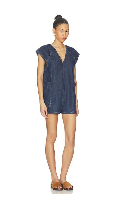 FREE PEOPLE X WE THE FREE FREE FALL DENIM ROMPER IN NAVY.