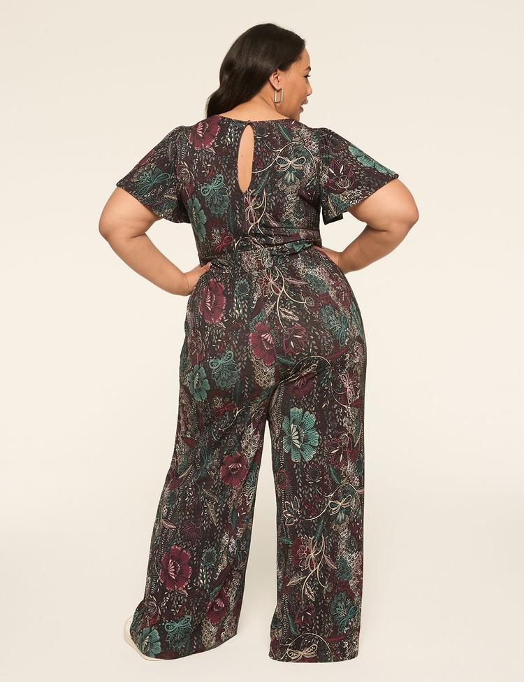 Available in Plus Size A one-and-done wonder that makes getting dressed so easy (and fun!) - you'll love the flutter sleeves, always-convenient pockets and soft, stretchy knit. FIT: Jumpsuit. Classic fit bodice and fitted waist with relaxed leg shape. Inseam Length: Regular: 26", Long: 29" FEATURES: V-neck Flutter sleeves Shirring at shoulders Double covered elastic waistband Pockets Single button keyhole closure at back FABRIC: Super soft and stretchy crepe knit Machine Wash 96% Rayon/4% Spandex Item Number #412597 Imported Plus Size Dress ". Plus Size Flutter-Sleeve Smocked-Waist Jumpsuit, in Dark Floral, 22/24, Women's, Lane Bryant
