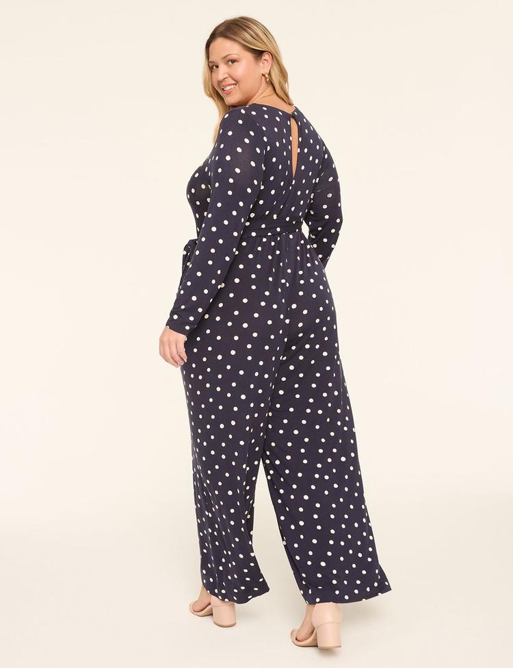 Soft jersey fabric and a relaxed wide-leg silhouette create an effortlessly polished look in this plus size jumpsuit. Featuring a flattering V-neck, long sleeves, and a self-tie belt that defines the waist, it balances comfort with classic style. The timeless navy base with white polka dots adds playful charm, while practical pockets and a button-back closure enhance functionality. Ideal for workwear, business casual settings, or casual daytime outings, this jumpsuit offers versatile sophistication and easy wearability across all seasons.