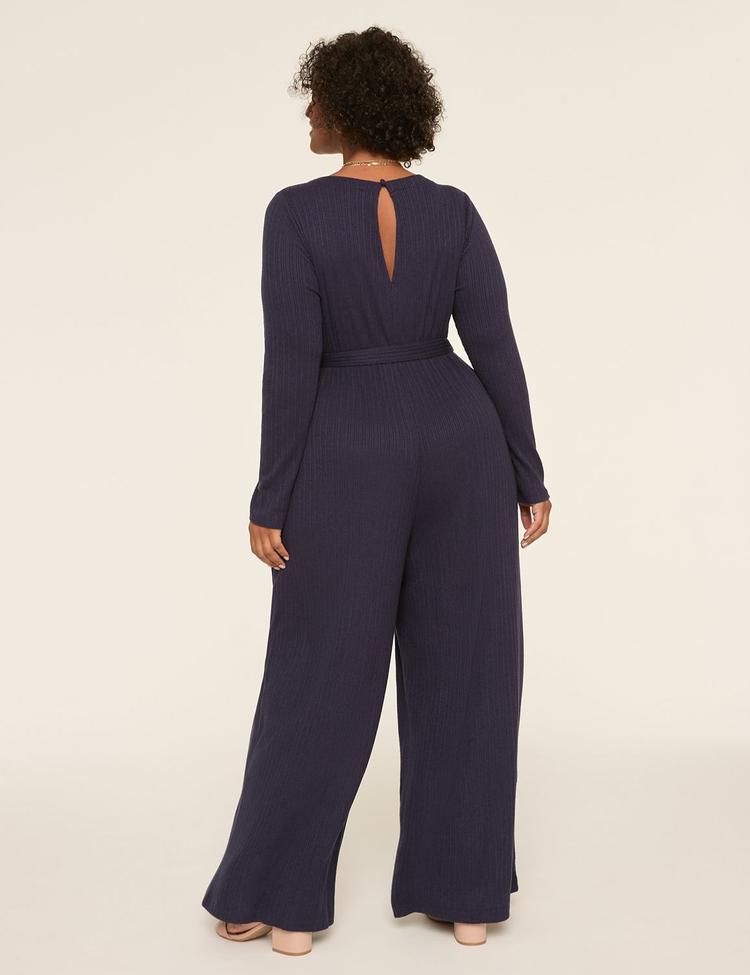 Soft ribbed knit fabric and a classic fit combine in this plus size jumpsuit to offer polished comfort all day long. Featuring a flattering V-neck and long sleeves, its tailored waist is defined by a matching self-tie belt, while wide-leg pants provide ease of movement. The keyhole back with button closure adds a subtle stylish touch. Ideal for workwear, casual outings, or business casual events, this maritime blue jumpsuit brings effortless style and versatile wearability with practical pockets and a clean hemline.