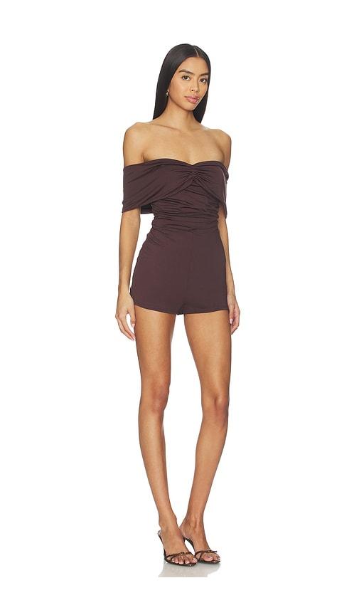 SUPERDOWN CHER OFF SHOULDER ROMPER IN BROWN.