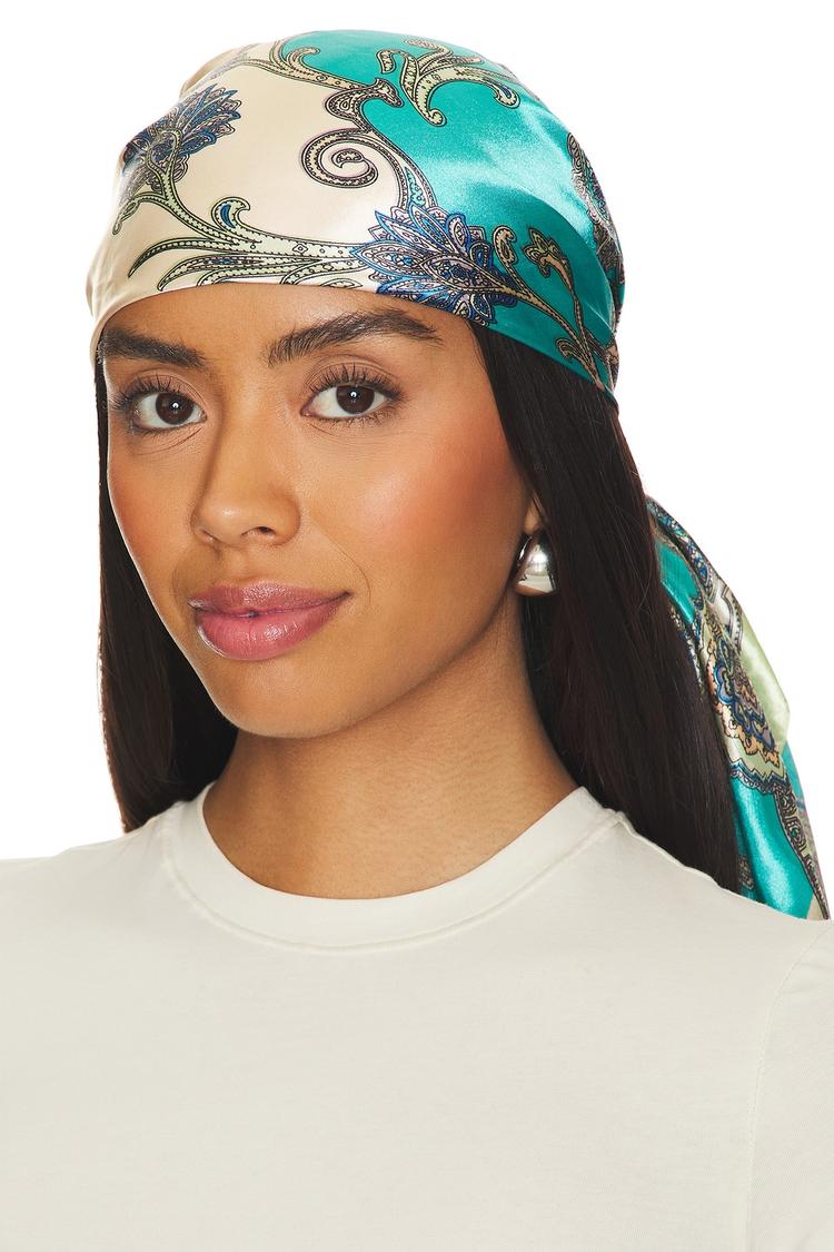 Elevate everyday looks with this satin head scarf from 8 Other Reasons. Measuring about 89 cm square, it drapes in a creamy beige base with bold turquoise paisley florals and teal accents, all finished with a vivid turquoise border for a pop of color. The silky satin sheen adds a luxe touch to hair, neck, or accessory styling, while the versatile square shape allows easy wraps, knots, or draped looks. Perfect for beach days, city strolls, or casual evenings, this scarf brings bohemian charm and refined polish to any outfit.