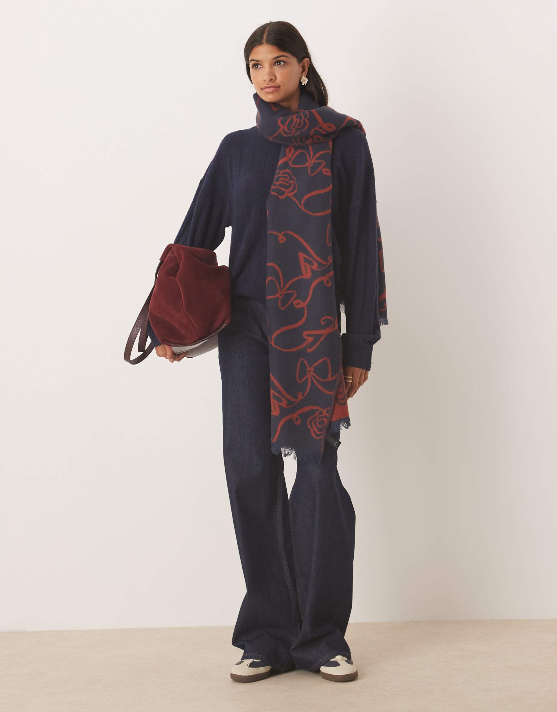 Complete your look with the perfect finishing touch—the ASOS DESIGN woven scarf in navy and burgundy. This rectangular scarf is crafted in a soft acrylic-polyester blend (70% acrylic, 30% polyester) for lightweight warmth and drape. The all-over jacquard features an abstract bow and floral motif, giving a refined, bohemian-chic feel. Frayed ends add easy texture, while the navy base with burgundy accents pairs with denim, knits, or coats. Whether daytime errands or evening outings, this scarf wraps you in color and comfort.