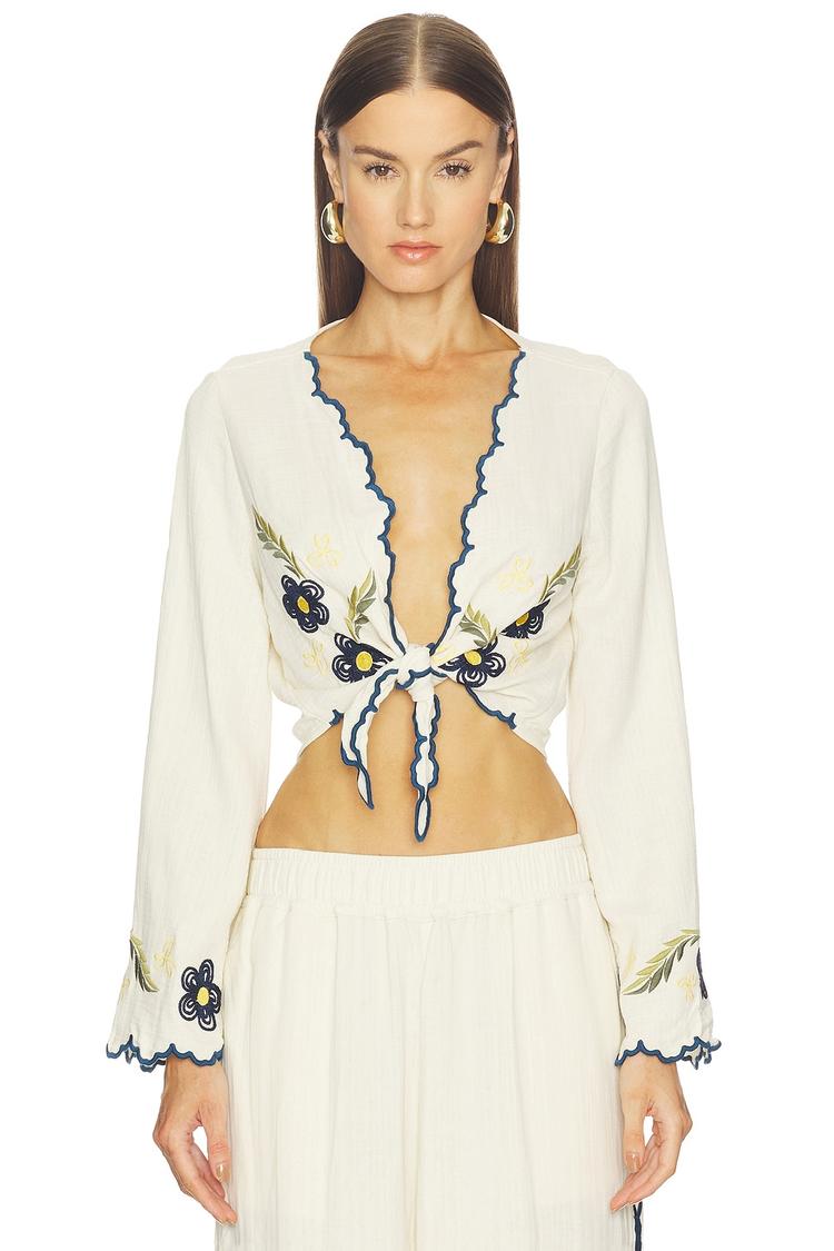 Soft cream viscose-cotton blend fabric meets delicate floral embroidery and a flattering wrap tie closure in this cropped Soleil Shirt. Featuring a deep V-neckline, fitted silhouette, and long sleeves with lettuce edge cuffs, this romantic bohemian piece is perfect for spring and summer casual outings, brunches, or vacation days. The ruffled trim along the neckline and cuffs adds a charming touch to this versatile top that pairs beautifully with high-waisted skirts or pants for an effortless casual chic look.