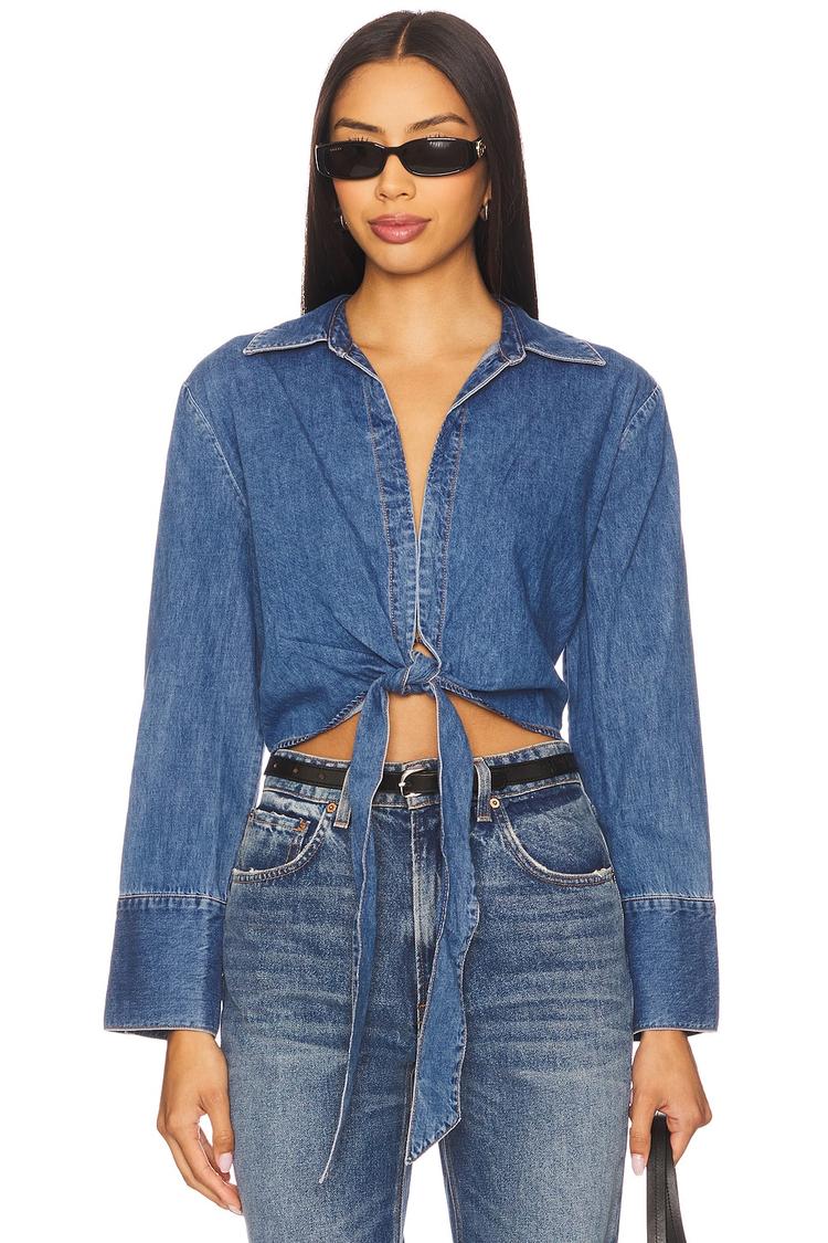 Lightweight denim fabric and a waist-length wrap silhouette combine for a versatile everyday staple. This classic button-down features long sleeves with button cuffs and a front tie closure that adds a casual chic touch. The regular fit and collar neckline create a balanced, relaxed look ideal for spring through autumn wear. Perfect for casual outings, brunch dates, or everyday errands, this matte blue wrap top pairs effortlessly with denim or tailored bottoms for a polished yet laid-back vibe.