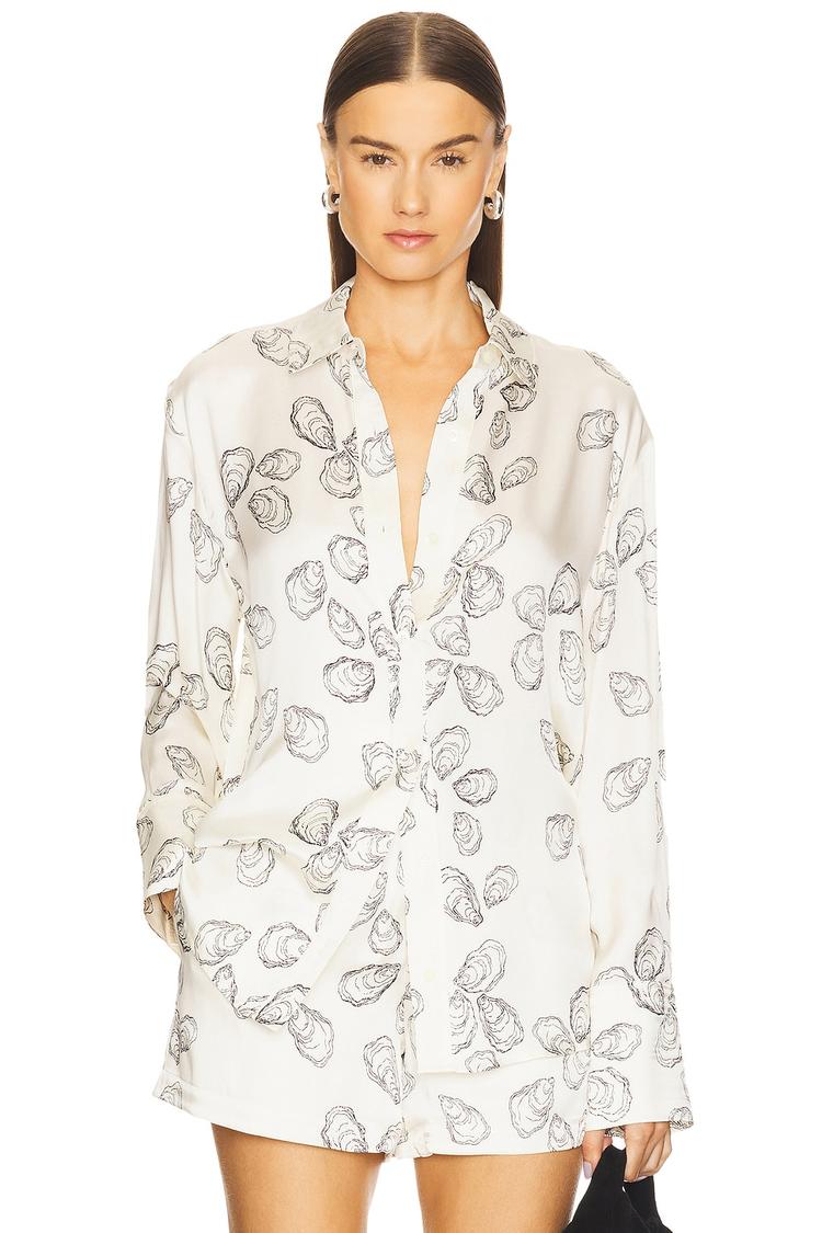 Midweight satin fabric and a relaxed fit come together in this classic Avalon Shirt by Anine Bing. Featuring a crisp collar and long sleeves with regular styling, this hip-length shirt is adorned with a subtle all-over botanical print in gray on a matte off-white base. Its front button closure enhances the minimalist elegance, making it ideal for business casual, workwear, or brunch occasions. The silk-rayon blend fabric offers smooth texture and refined drape for versatile year-round wear.