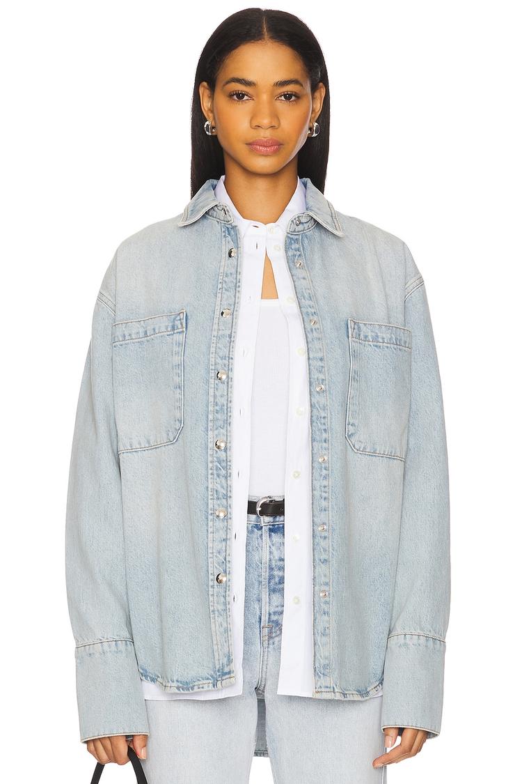 Heavyweight denim in a relaxed, classic shirt silhouette defines this hip-length piece. Featuring a traditional collar and long sleeves with button cuffs, the front showcases silver-tone snap buttons and chest slip pockets for functional style. Its solid light blue wash makes it a versatile layering option for casual, streetwear, and travel occasions across spring, autumn, and all-weather seasons. Crafted from 100% cotton denim, this shirt balances comfort and durability while delivering a timeless, casual chic vibe.