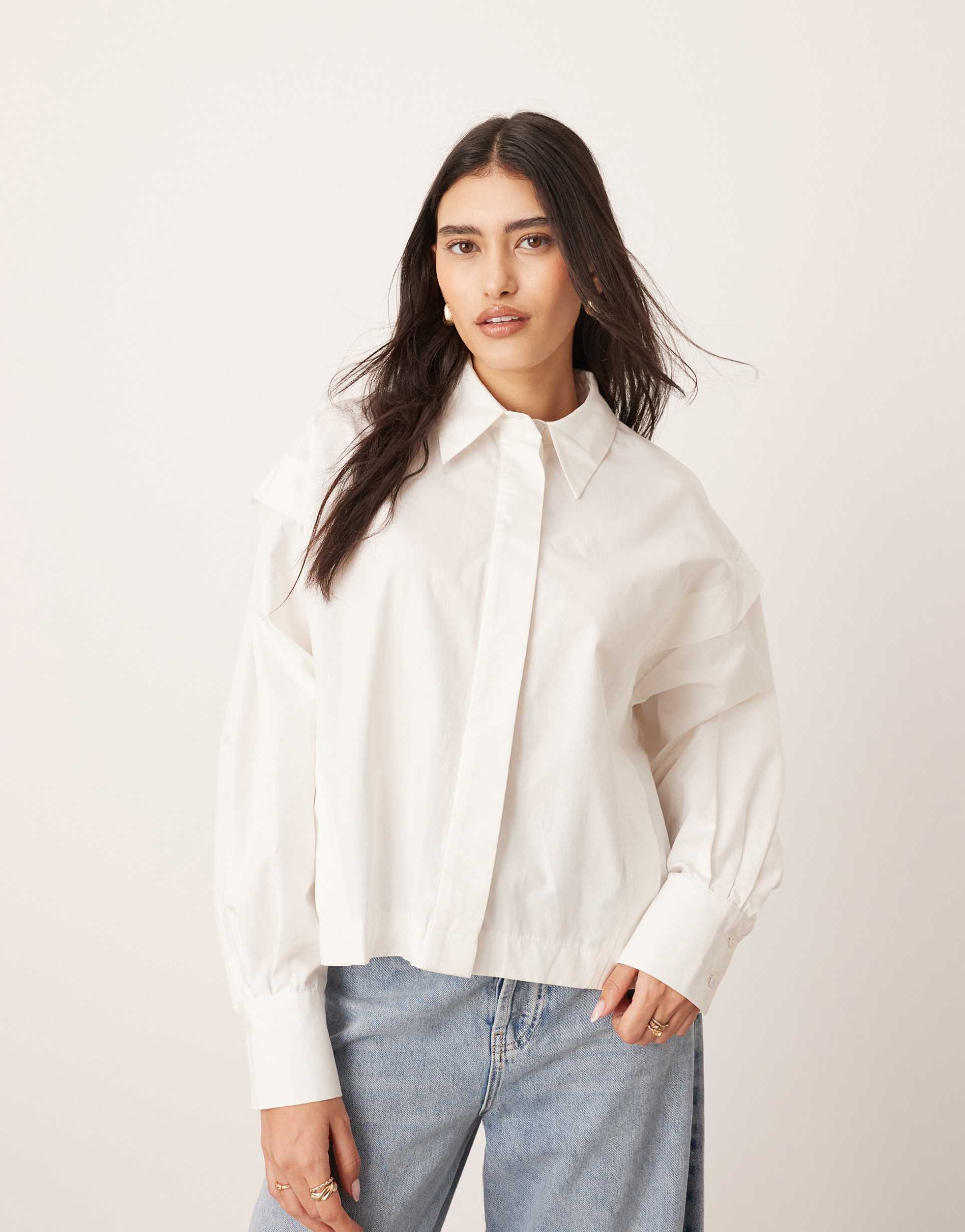 Crisp cotton poplin and a boxy fit define this hip-length shirt featuring long sleeves and a classic pointed collar. The pleated shoulder detail adds subtle structure to its minimalist, casual chic style. Perfect for casual outings, workwear, and business casual settings, this versatile white woven shirt pairs effortlessly with jeans or tailored trousers for a refined yet relaxed look across spring, autumn, and all-weather seasons.