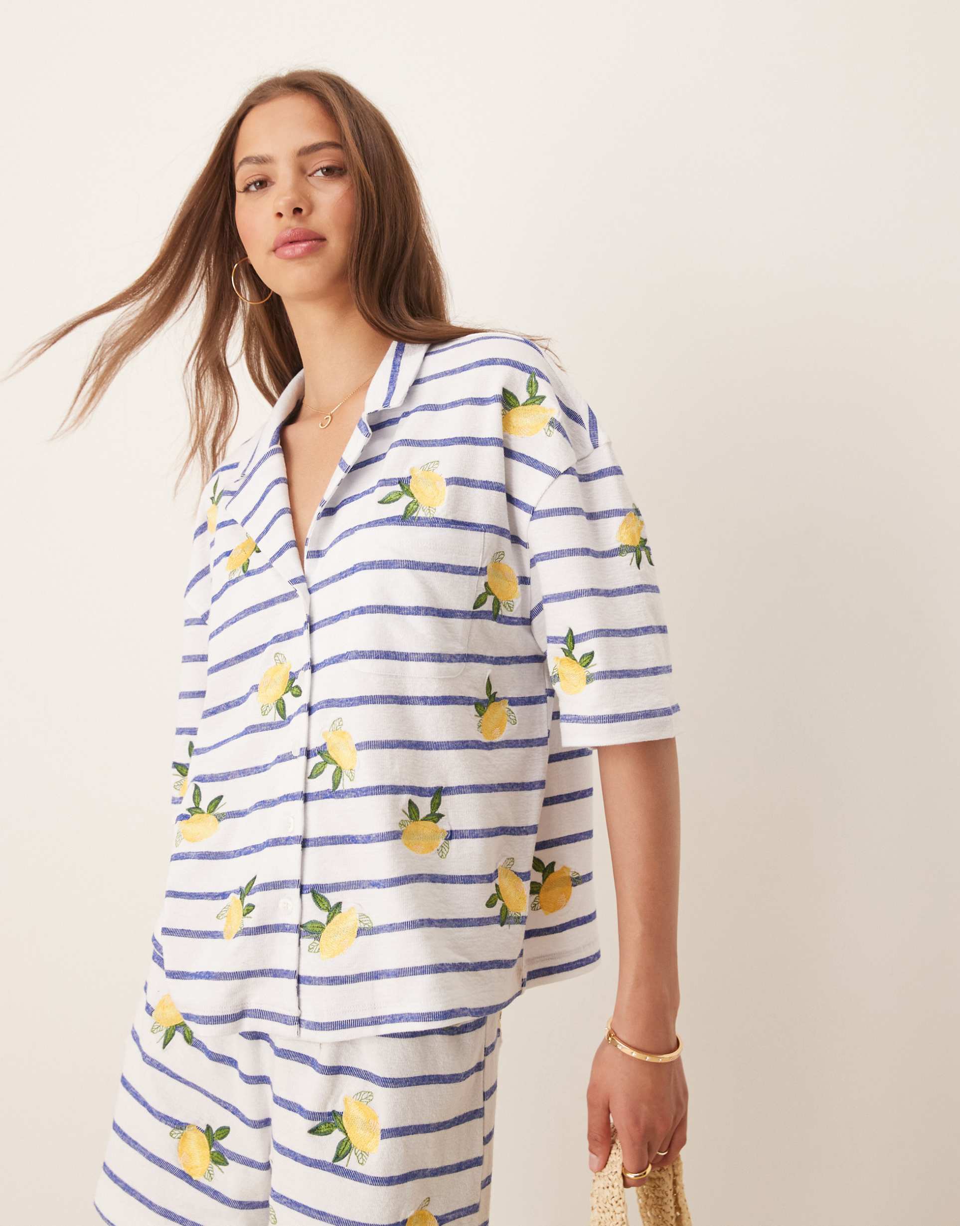 ASOS DESIGN CAMP STRIPE SHIRT WITH LEMON EMBROIDERY