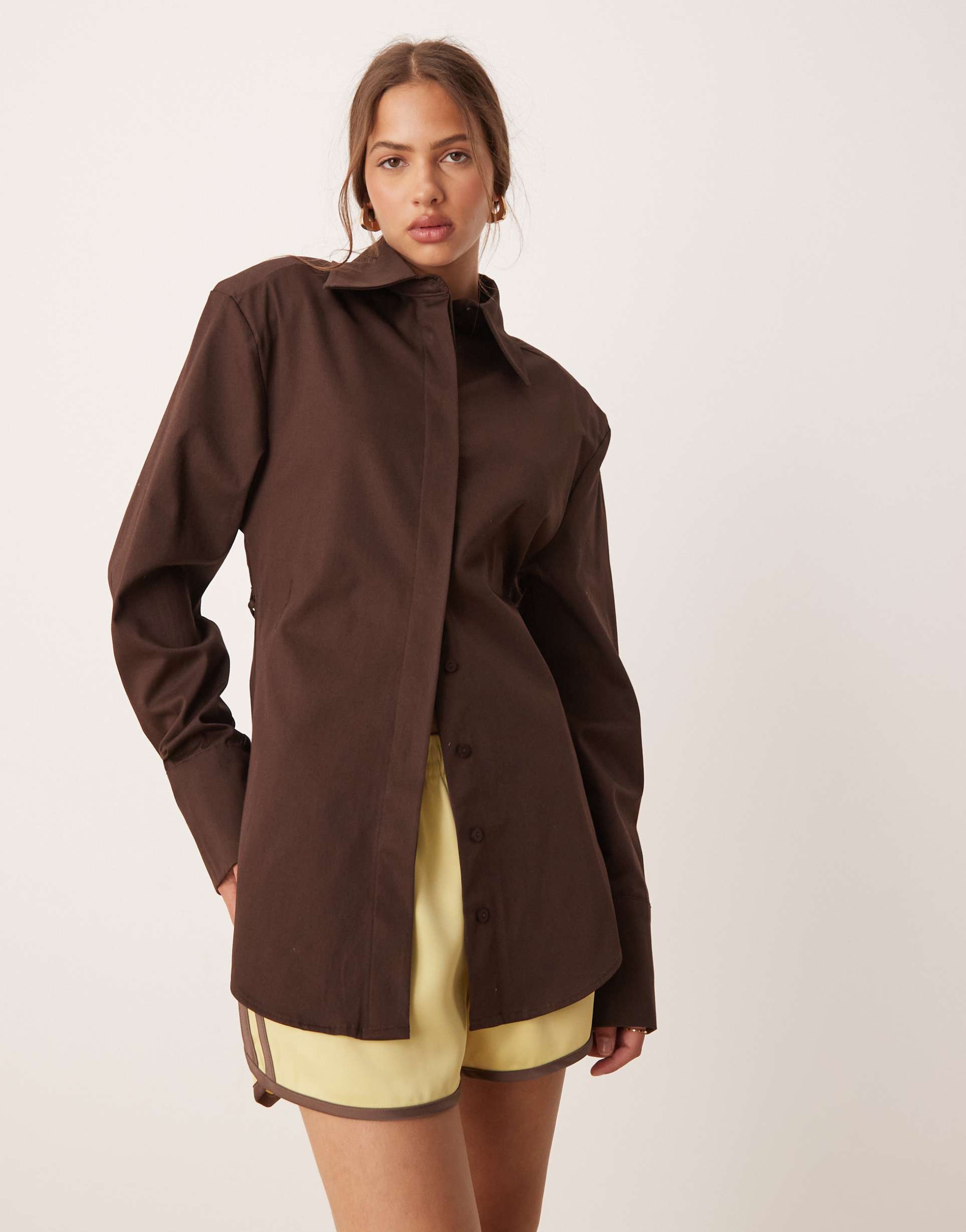 Crisp matte brown cotton with a tailored spread collar and long regular sleeves defines this ASOS DESIGN shirt. The hip-length silhouette features structured padded shoulders creating a sophisticated shape, while the unique tie-back adds a modern twist to the classic button-up style. Crafted with a cotton-elastane blend, it offers comfort and subtle stretch for all-day wear. Ideal for casual outings, workwear, and business casual settings, this versatile shirt balances timeless elegance with contemporary detailing to elevate your everyday wardrobe.