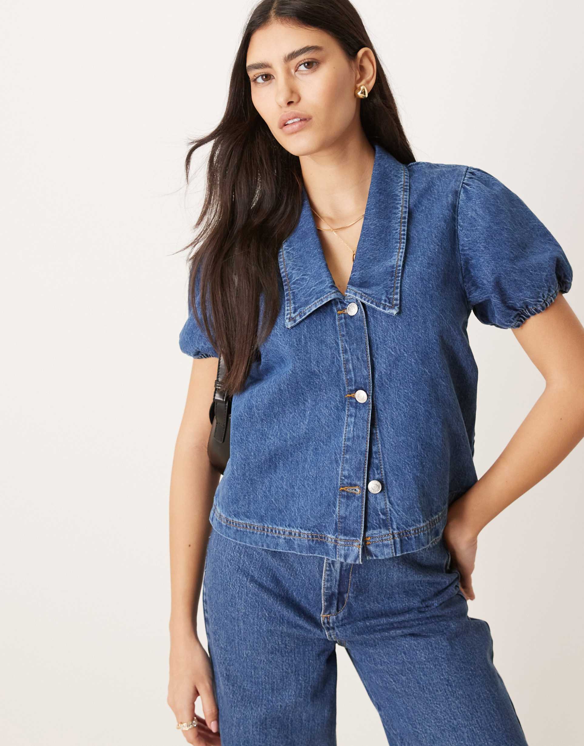 Mid-blue matte denim fabric defines this classic ASOS DESIGN shirt featuring a point collar and a front button placket. Its regular fit and hip length silhouette balance the playful puffed half sleeves, creating a casual chic vibe perfect for spring, summer, and autumn outings. Ideal for everyday wear, casual meetups, or street style looks, this non-stretch cotton denim shirt offers both comfort and style with timeless appeal.