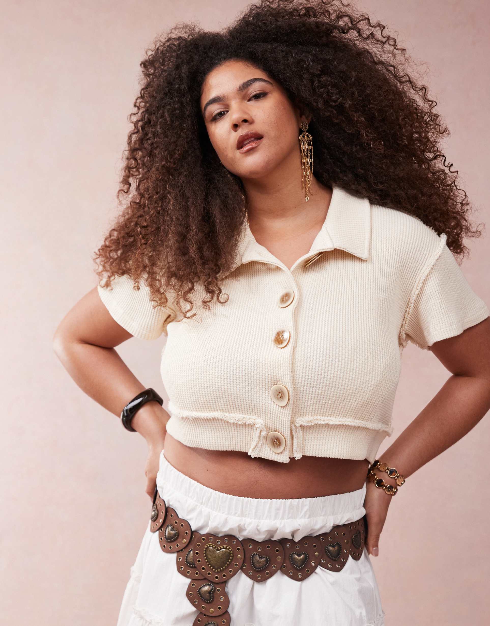ASOS DESIGN CURVE BUTTON DOWN CROPPED WAFFLE SHIRT IN CREAM