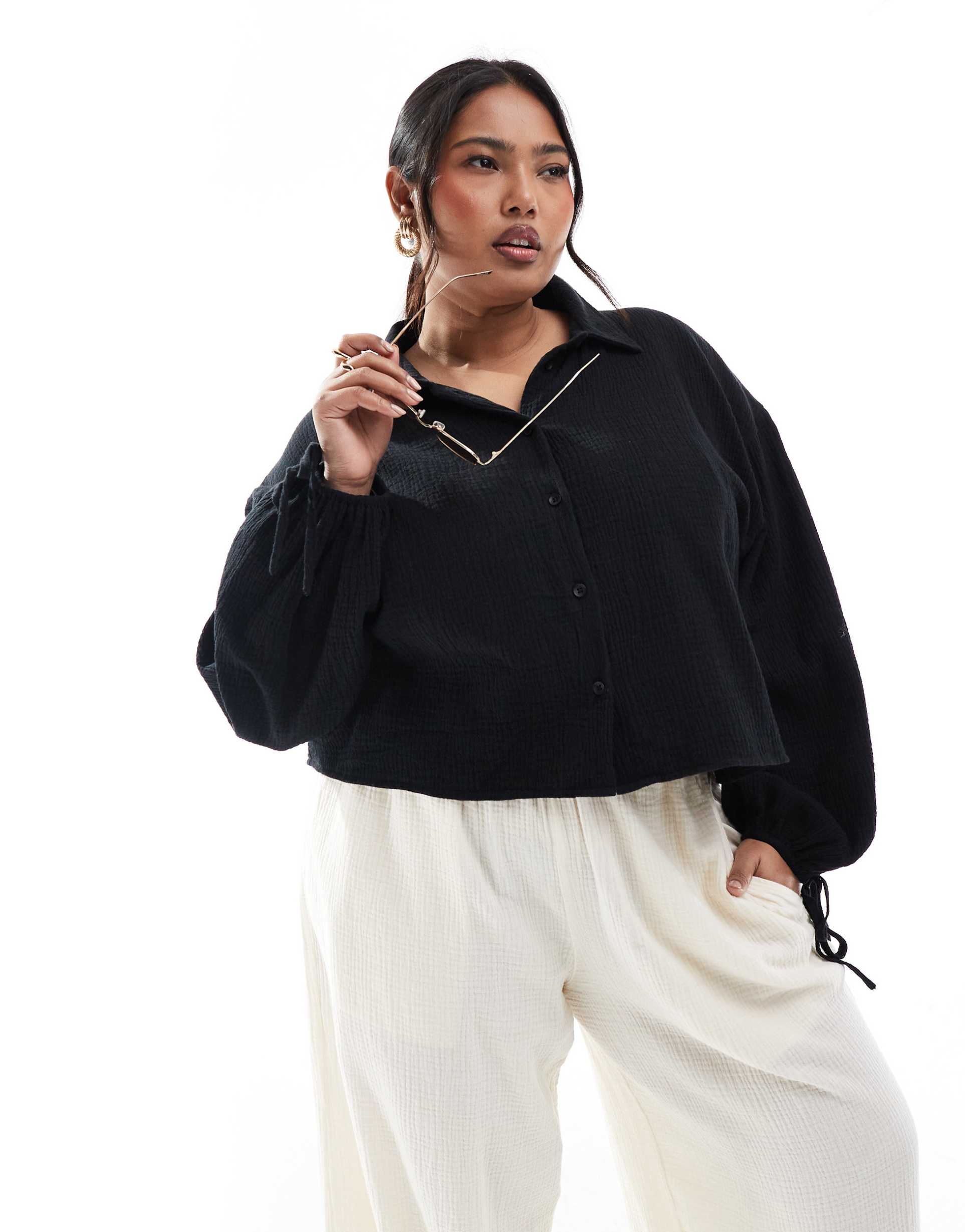 ASOS DESIGN CURVE CROPPED TEXTURED COTTON SHIRT IN BLACK