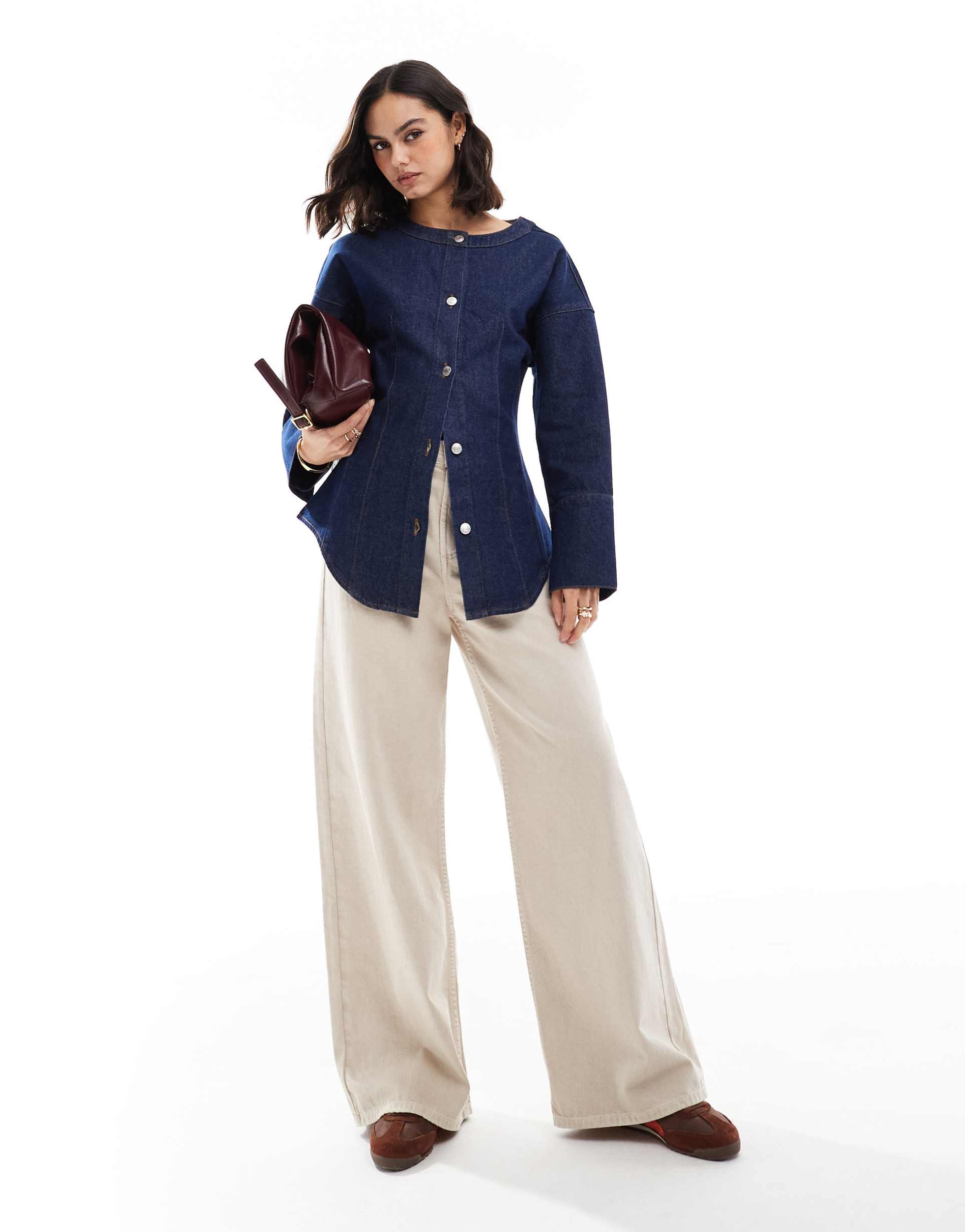 This classic ASOS DESIGN denim shirt features a dark blue wash crafted from 100% cotton for breathable comfort. Designed with a round neck and long sleeves, it offers a regular fit cinched at the waist to enhance silhouette definition. The front button placket adds a timeless touch, while the hip-length hem ensures versatile styling options. Ideal for casual days, everyday wear, and casual work environments, this shirt pairs effortlessly with wide-leg trousers or jeans for a chic, laid-back look.