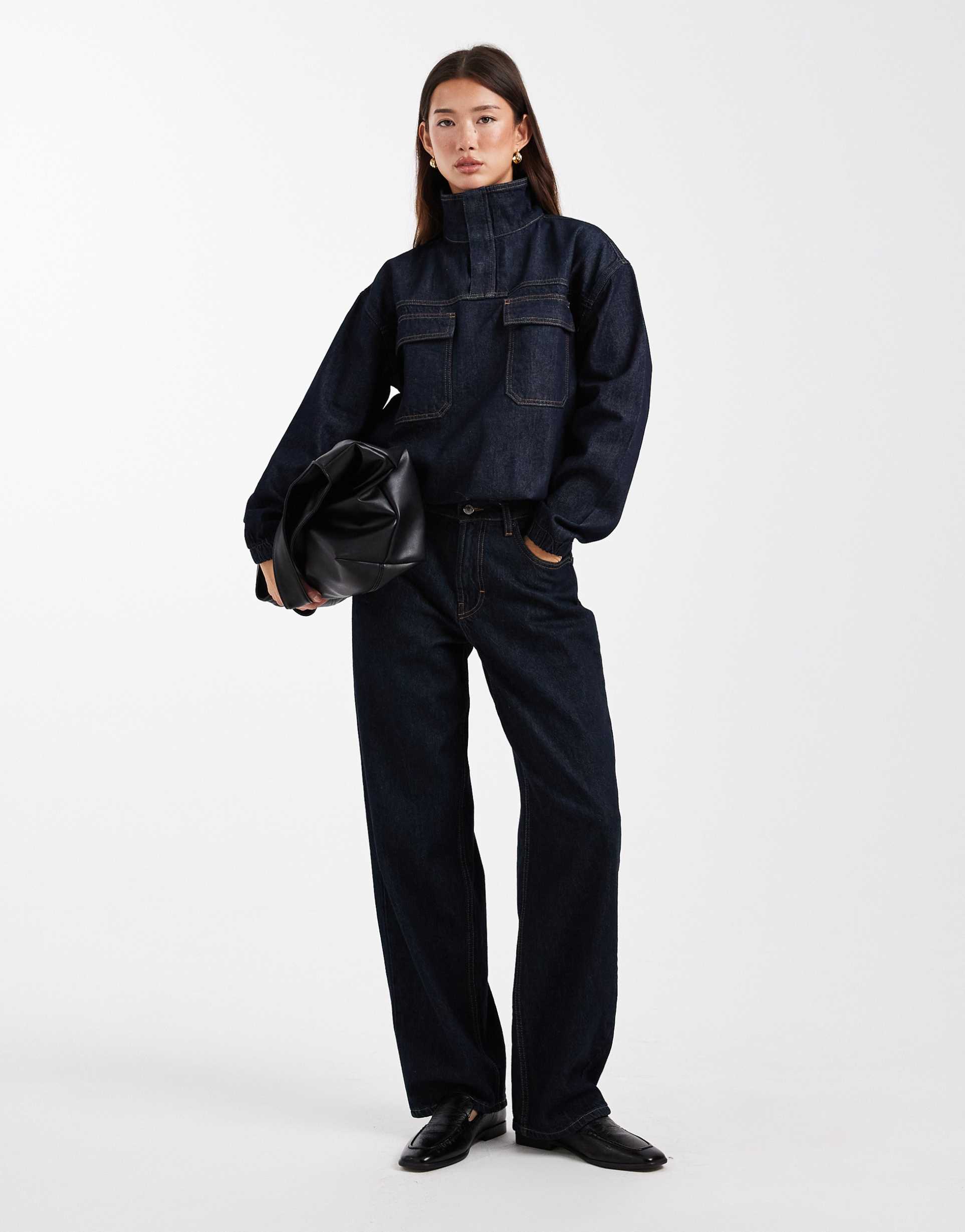 ASOS DESIGN DENIM FUNNEL NECK SHIRT IN INDIGO
